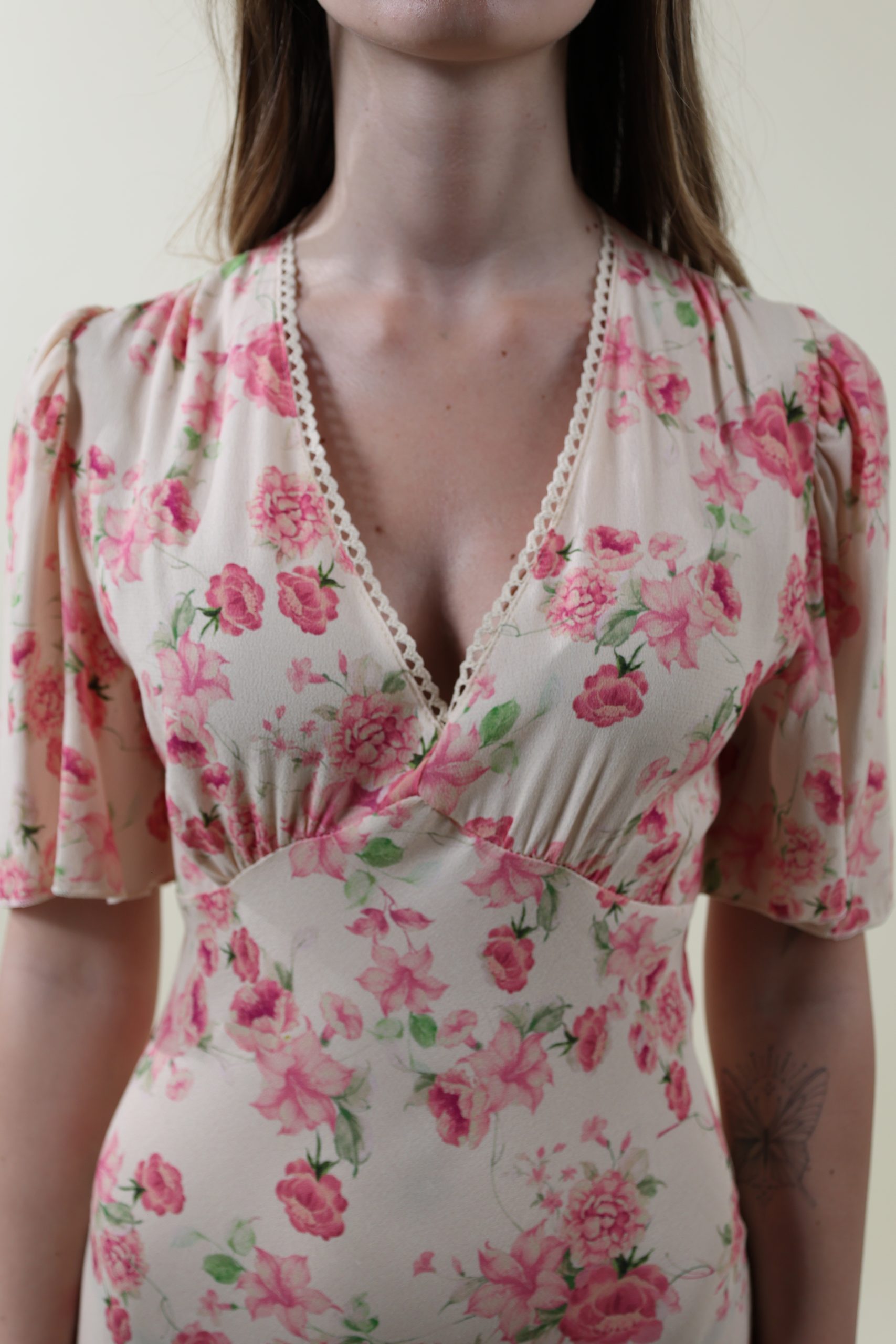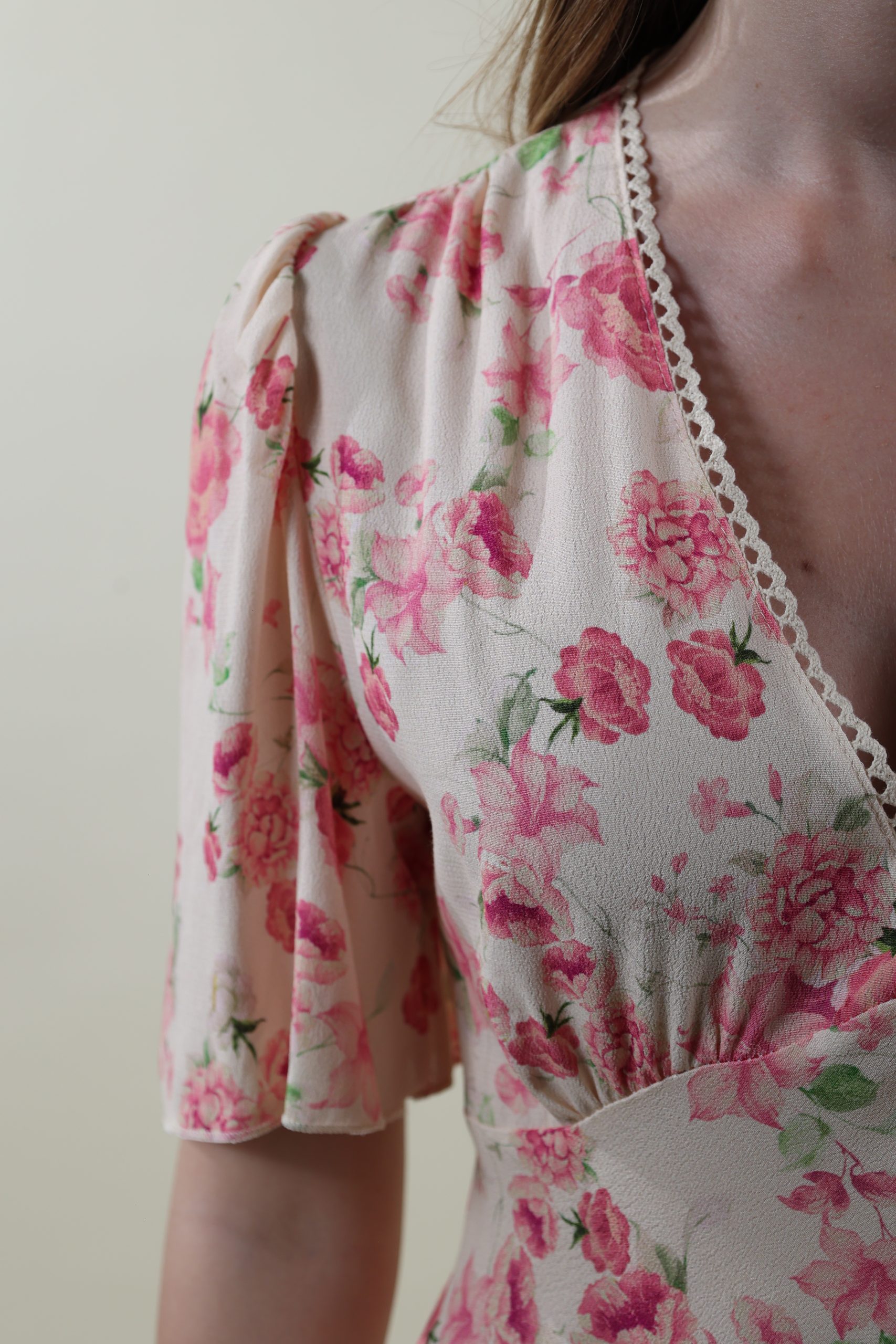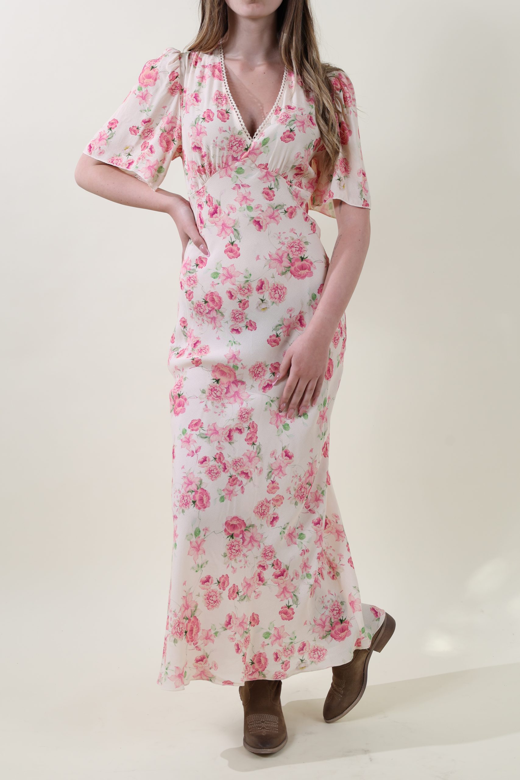Abito in marocaine di viscosa dalla linea iperfemminile, scollo V rifinito con un pizzetto a smerlo e manica corta leggermente arricciata. Taglio sotto al seno e gonna tagliata in sbieco. Vestibilità asciutta, taglie SM (40-42) e ML (44).