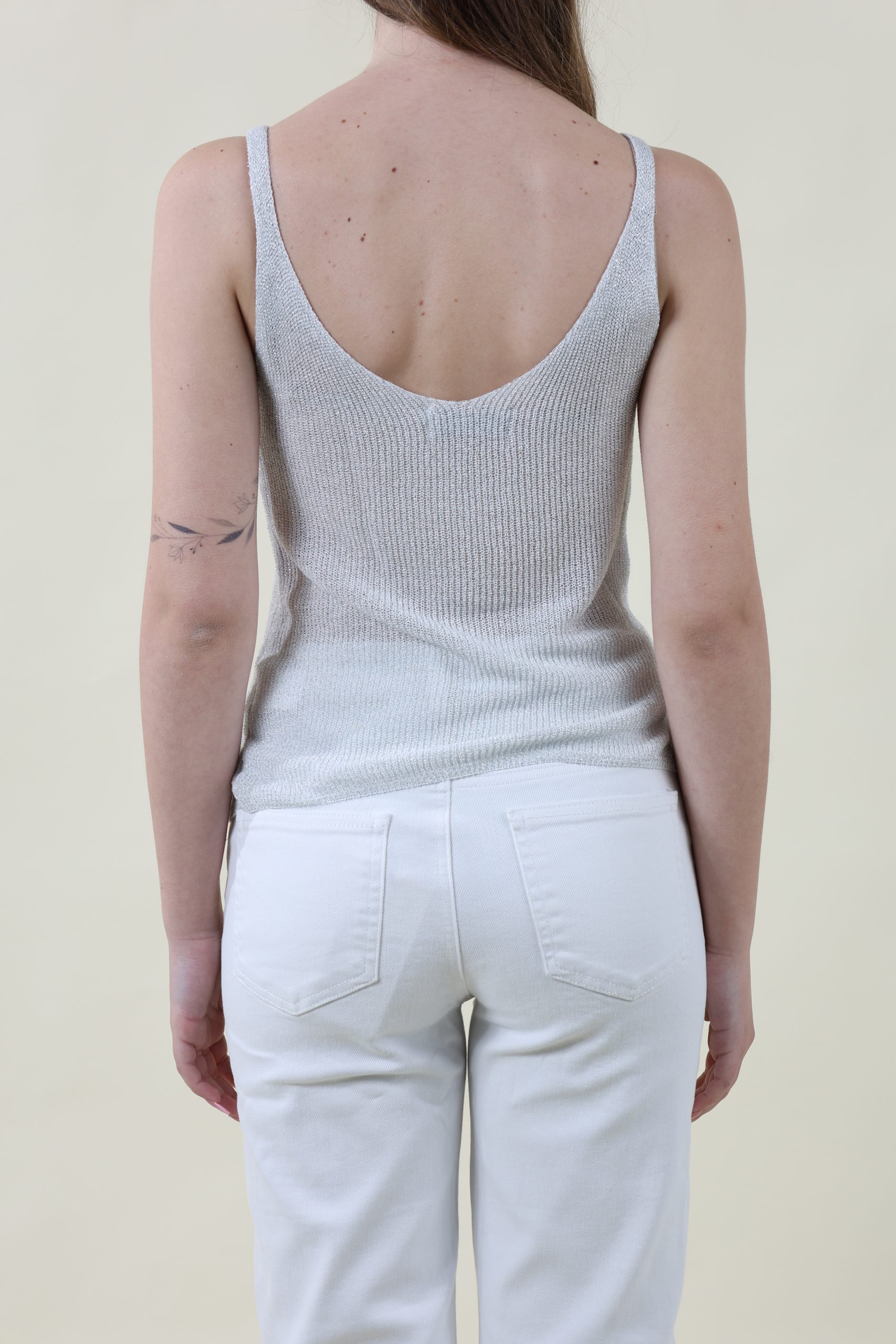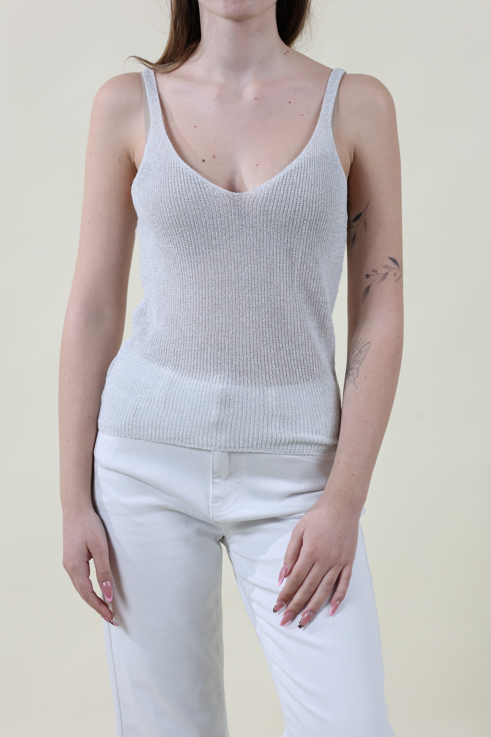 Canotta di maglia di viscosa lavorata a costina lurex. Il capo furbo e facile che si abbina a tutto il guardaroba. Fit morbido ed elasticizzato, taglia unica, veste dalla 40 alla 46.