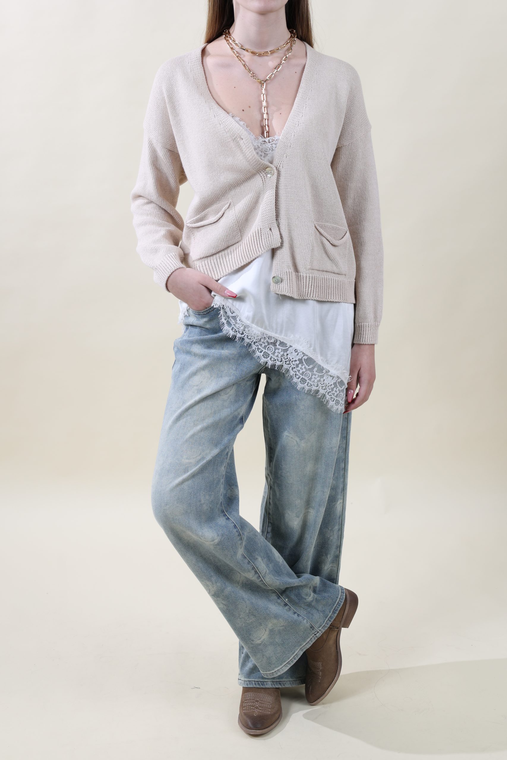 Cardigan in maglia di cotone a maglia rasata con taschine davanti. Fit morbido, taglia unica, veste dalla 40 alla 46.