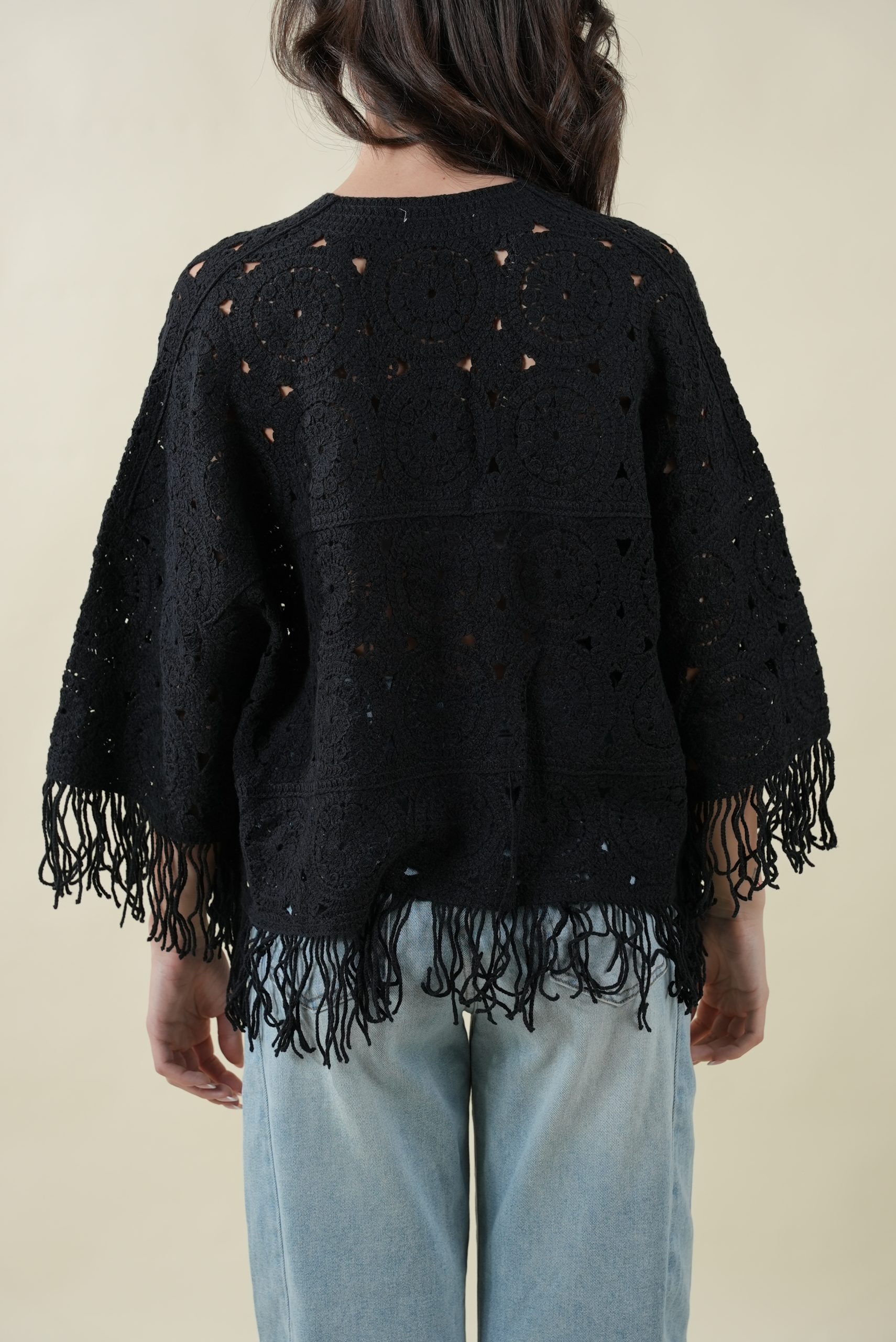 Cardigan in tessuto ricamato tipo uncinetto con finitura maniche e fondo sfrangiate. Fit morbido, taglie SM (40-44) e ML (46-48).