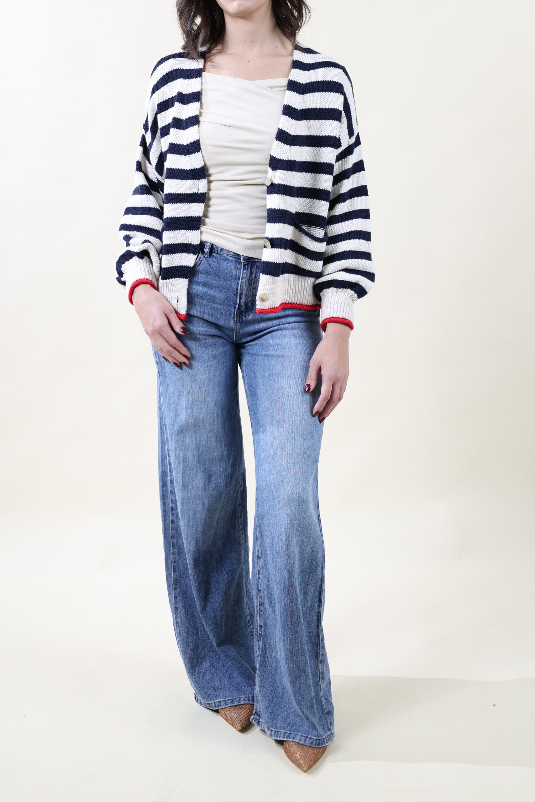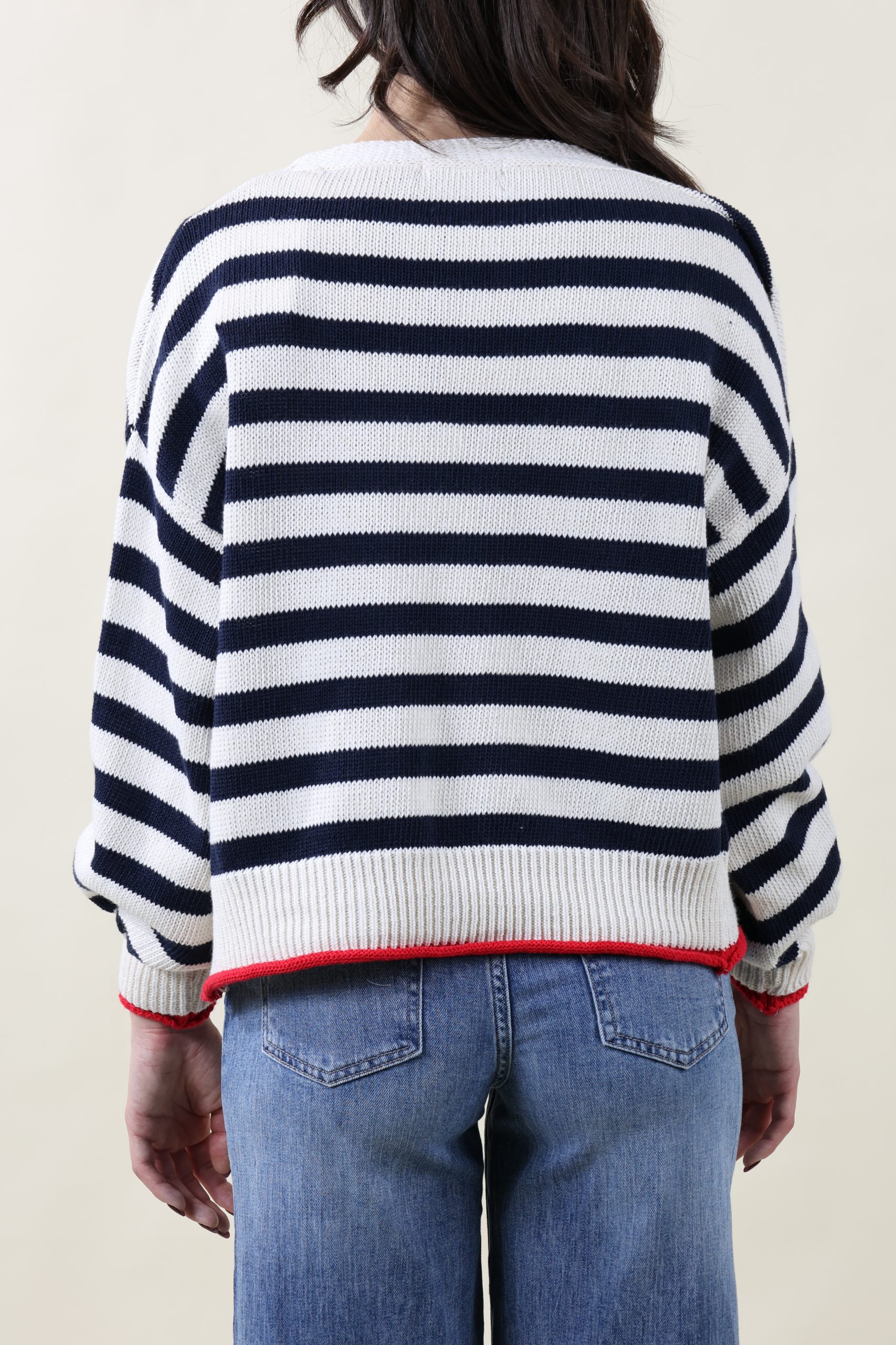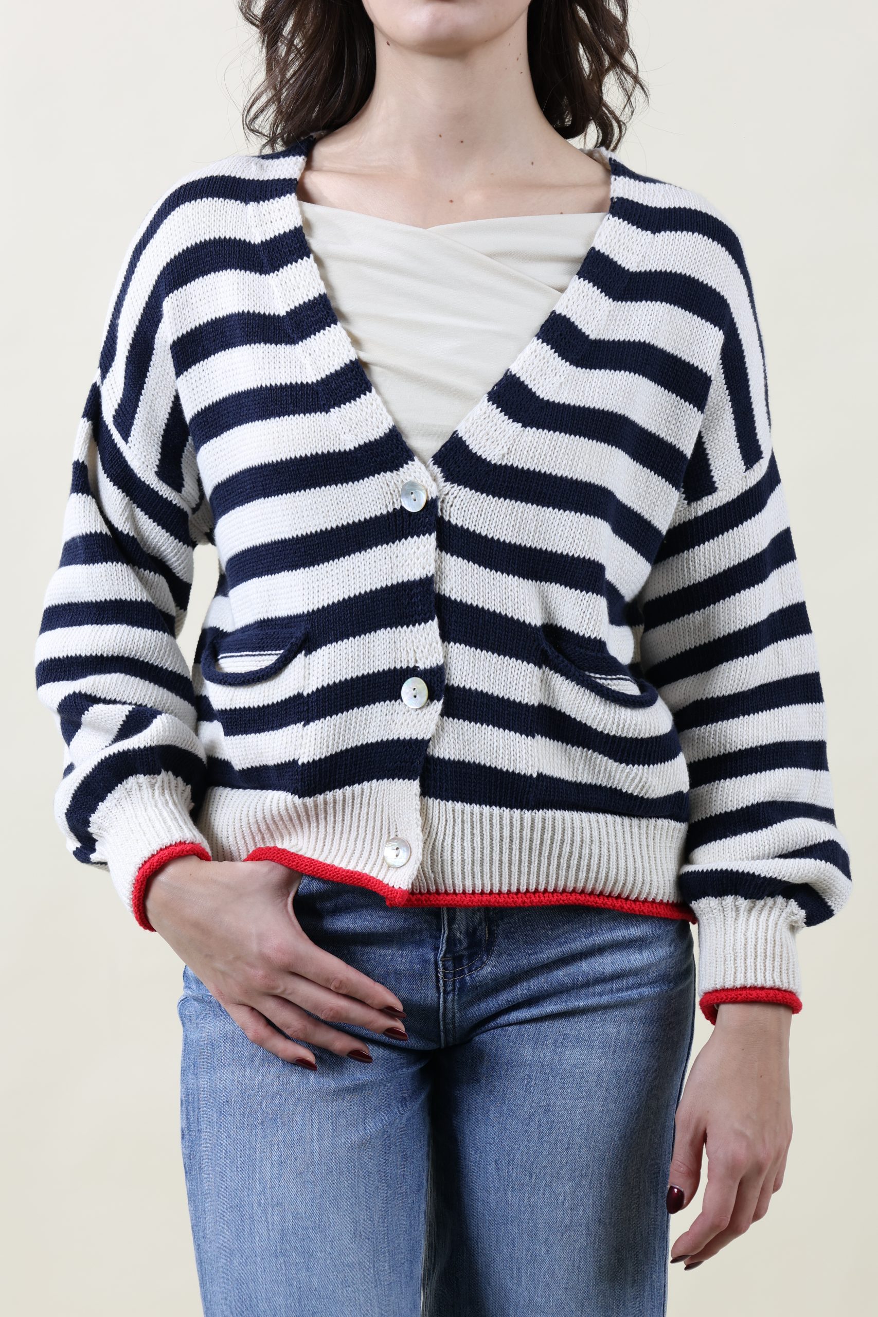 Cardigan in cotone rigato con taschine applicate e bottoni. Motivo di riga con profili a contrasto. Vestibilità morbida, taglia unica, veste dalla 40 alla 46.
