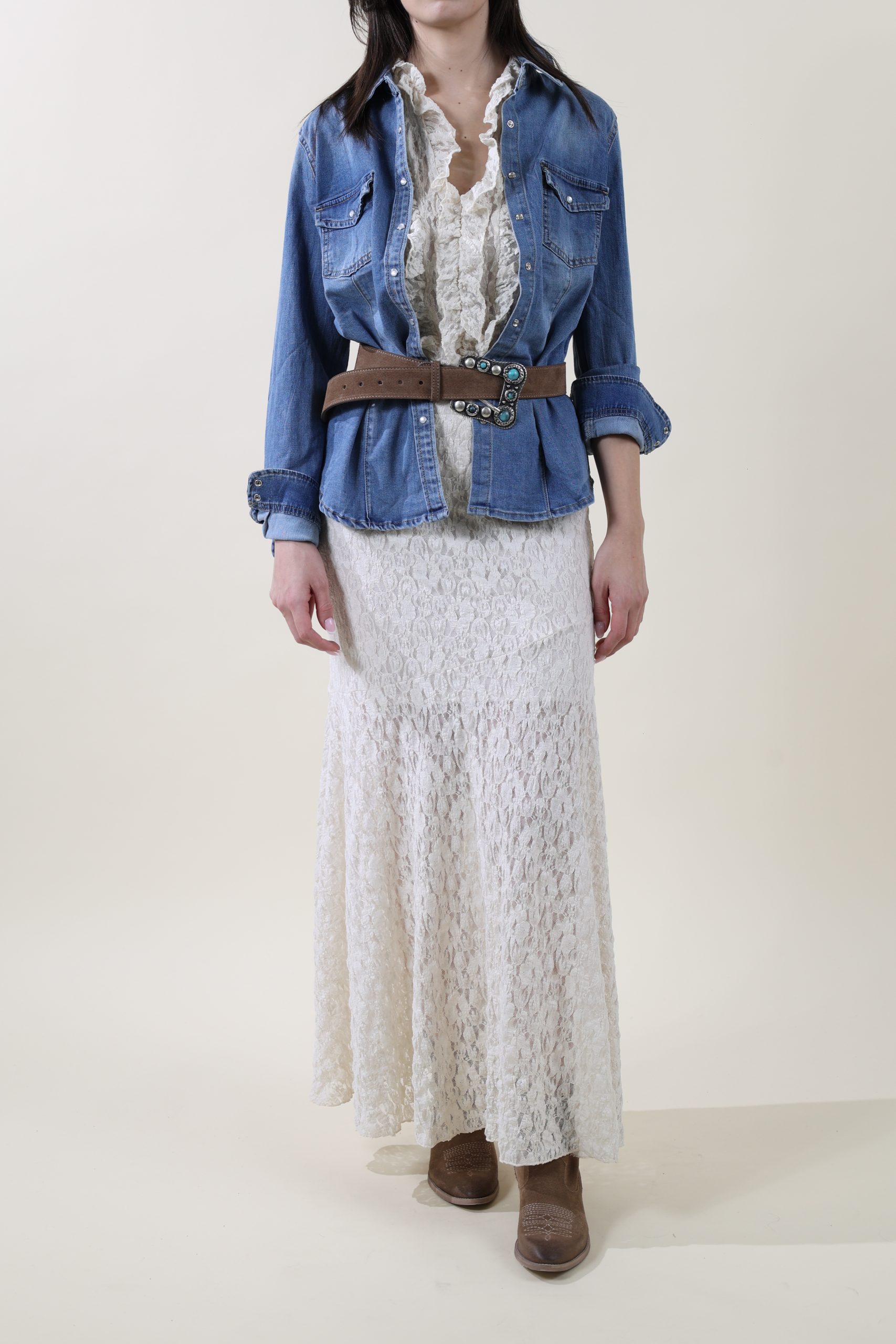Cintura in camoscio con fibbia molto particolare con incastonati turchesi. Altezza adatta per essere infilata nei passanti. Interamente lavorata a mano e made in Italy.