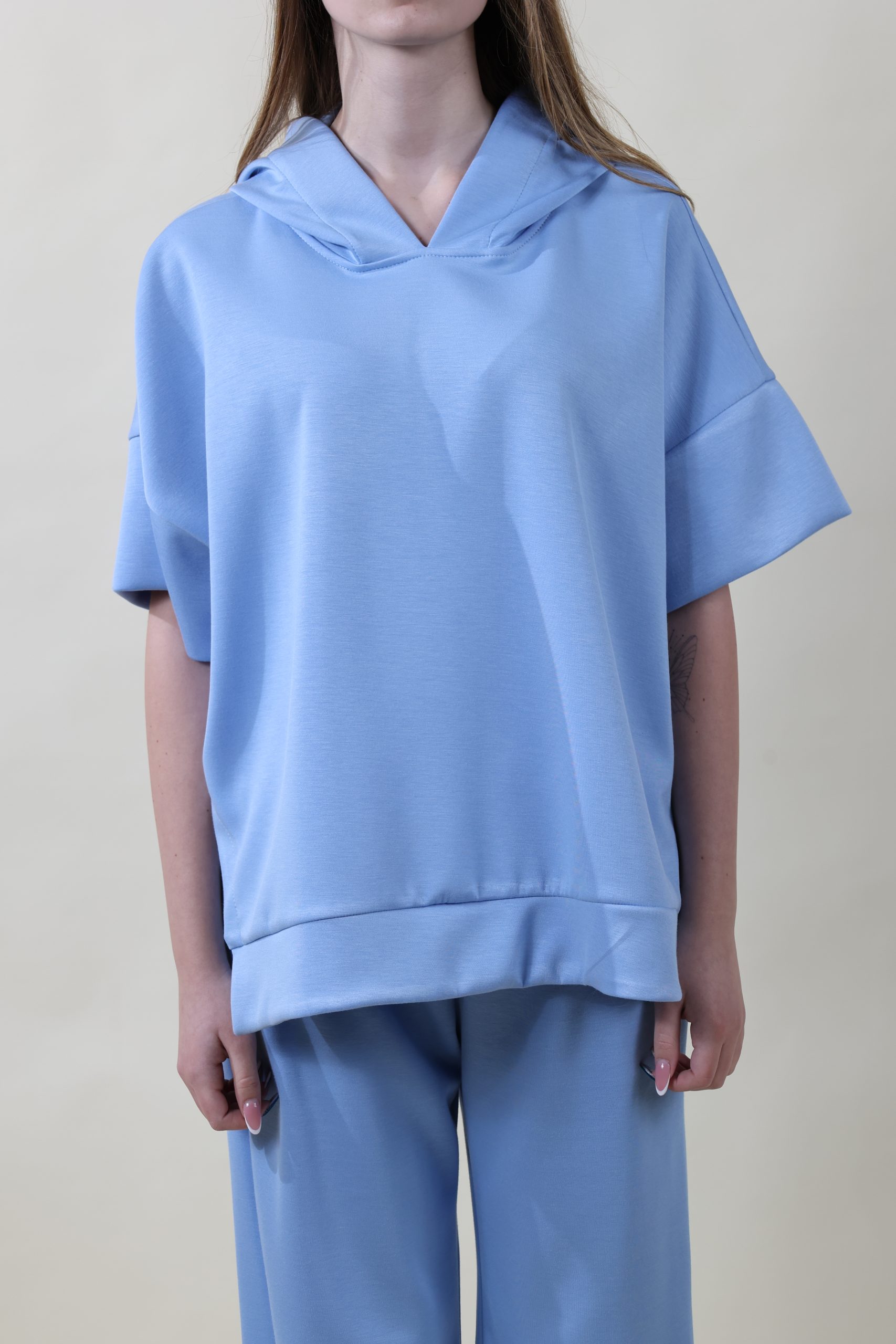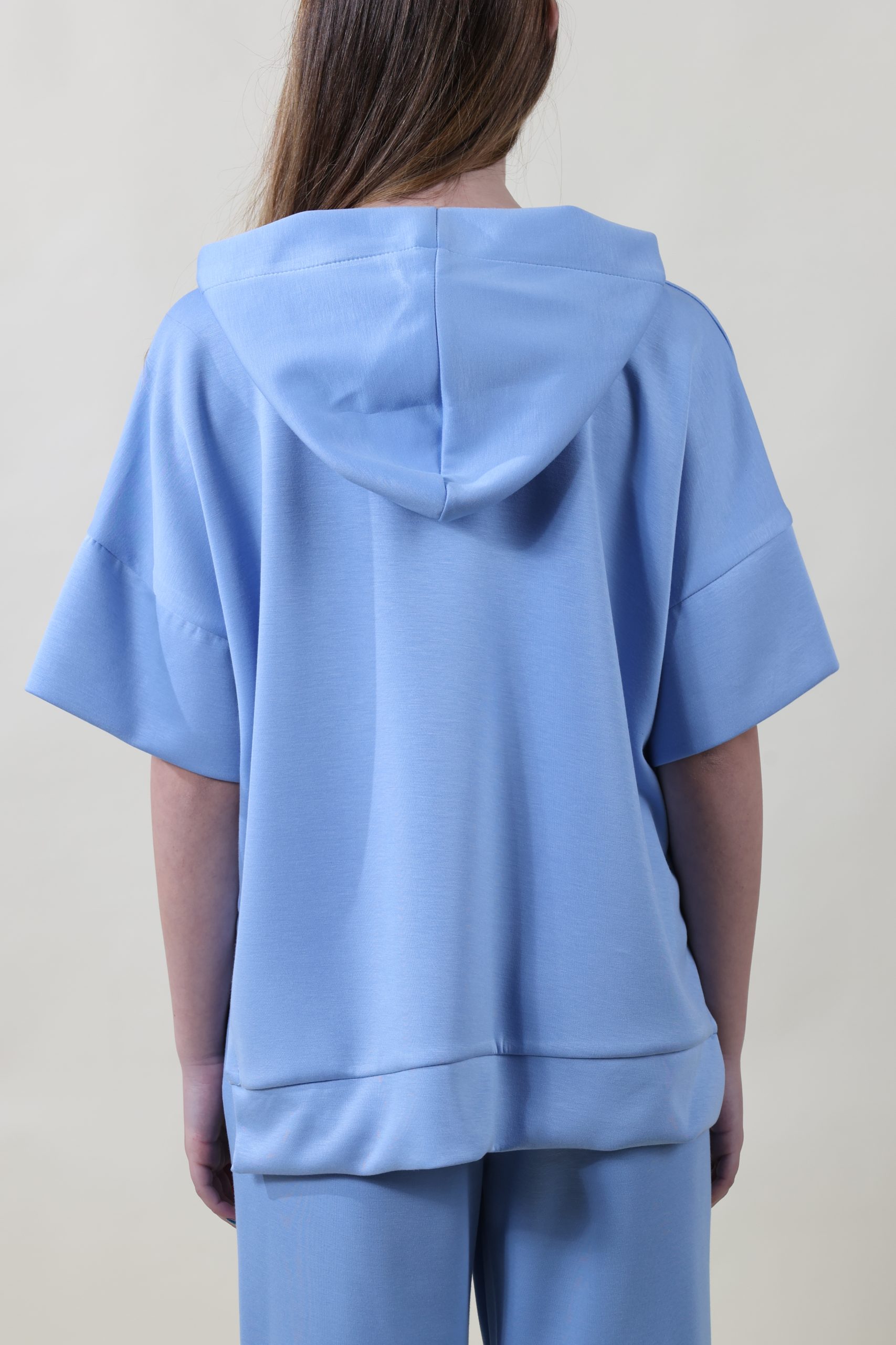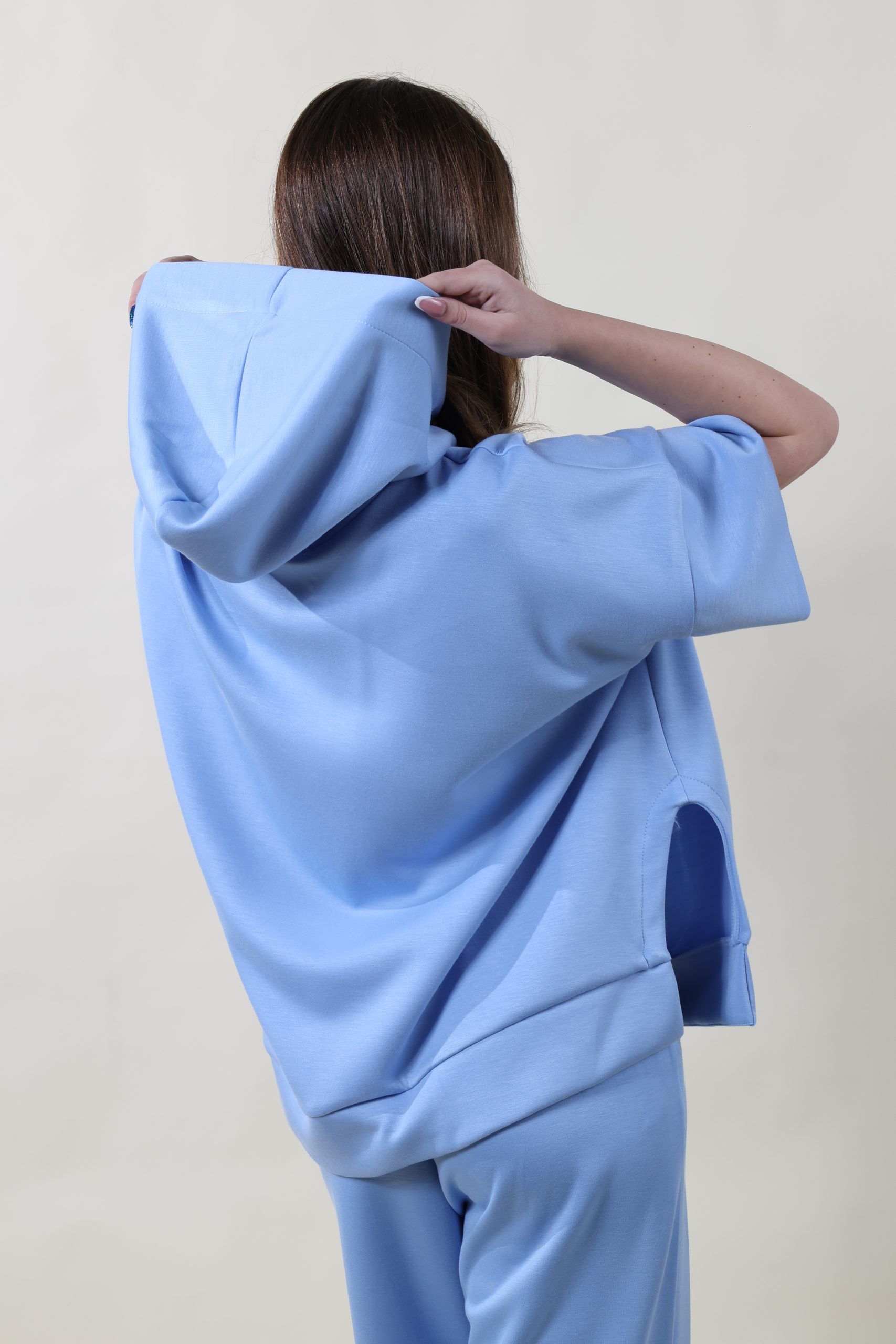 Felpa in tessuto morbidissimo di viscosa con cappuccio, spacchi laterali e manica a tre quarti con polsone creata per sovrapposizioni. Taglia unica, veste molto morbido, dalla 40 alla 48.