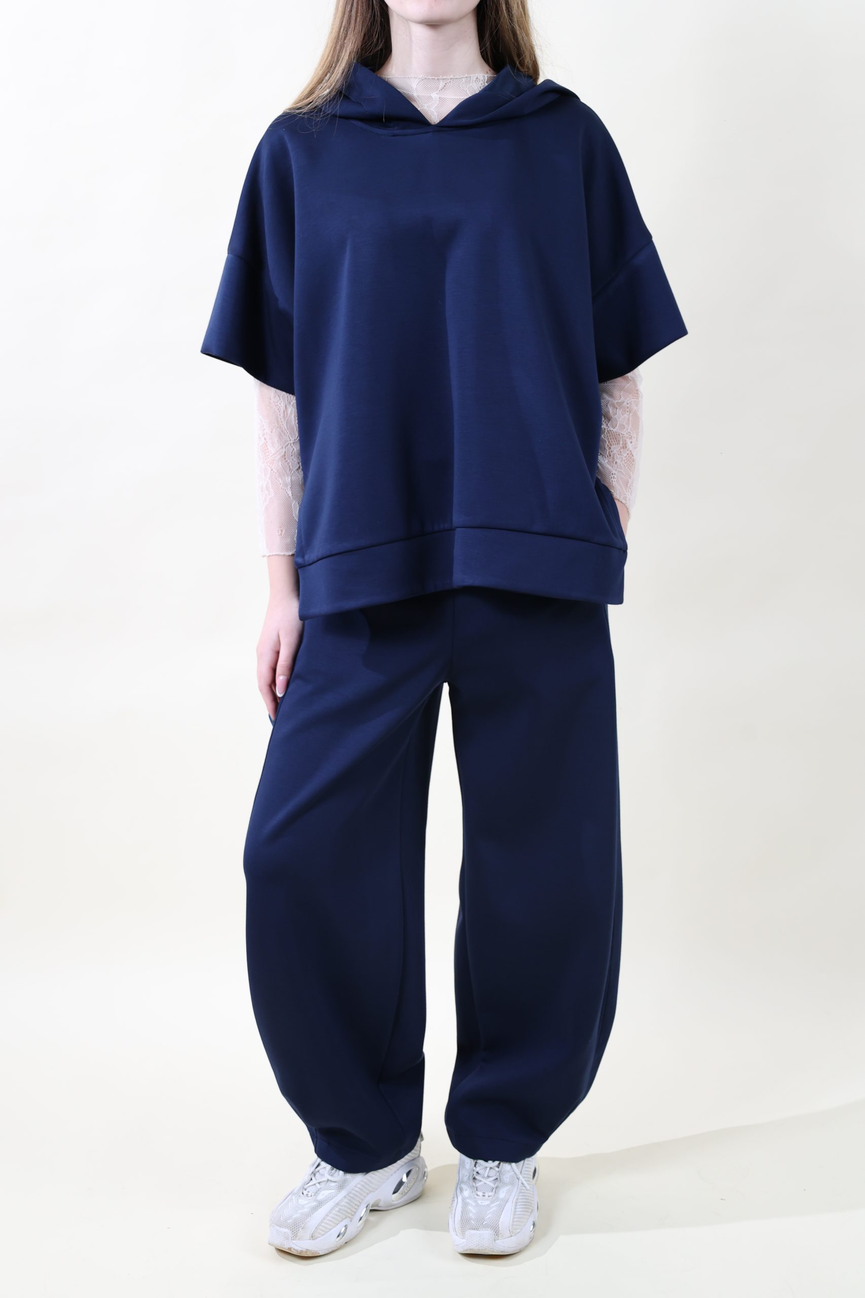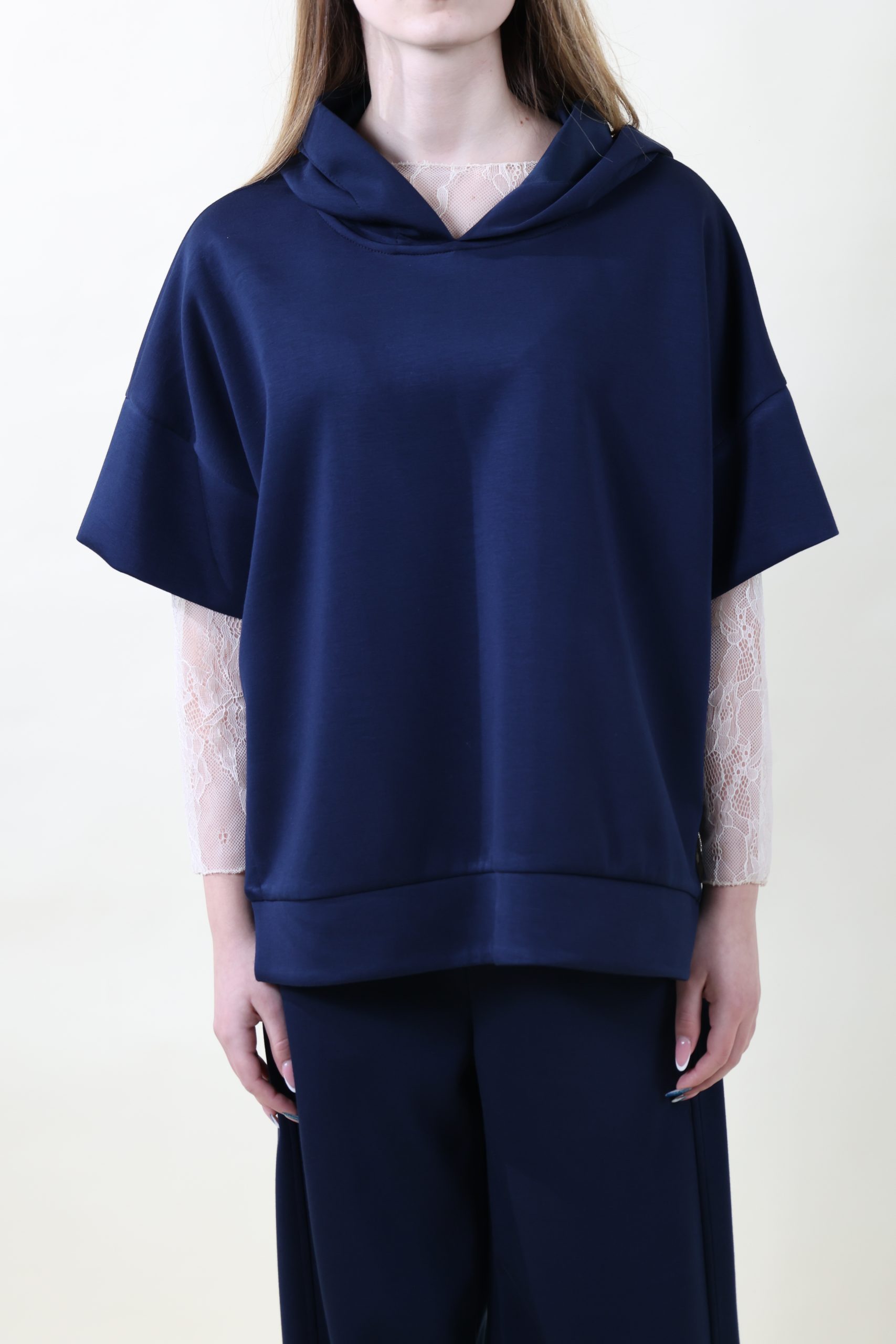 Felpa in tessuto morbidissimo di viscosa con cappuccio, spacchi laterali e manica a tre quarti con polsone creata per sovrapposizioni. Taglia unica, veste molto morbido, dalla 40 alla 48.