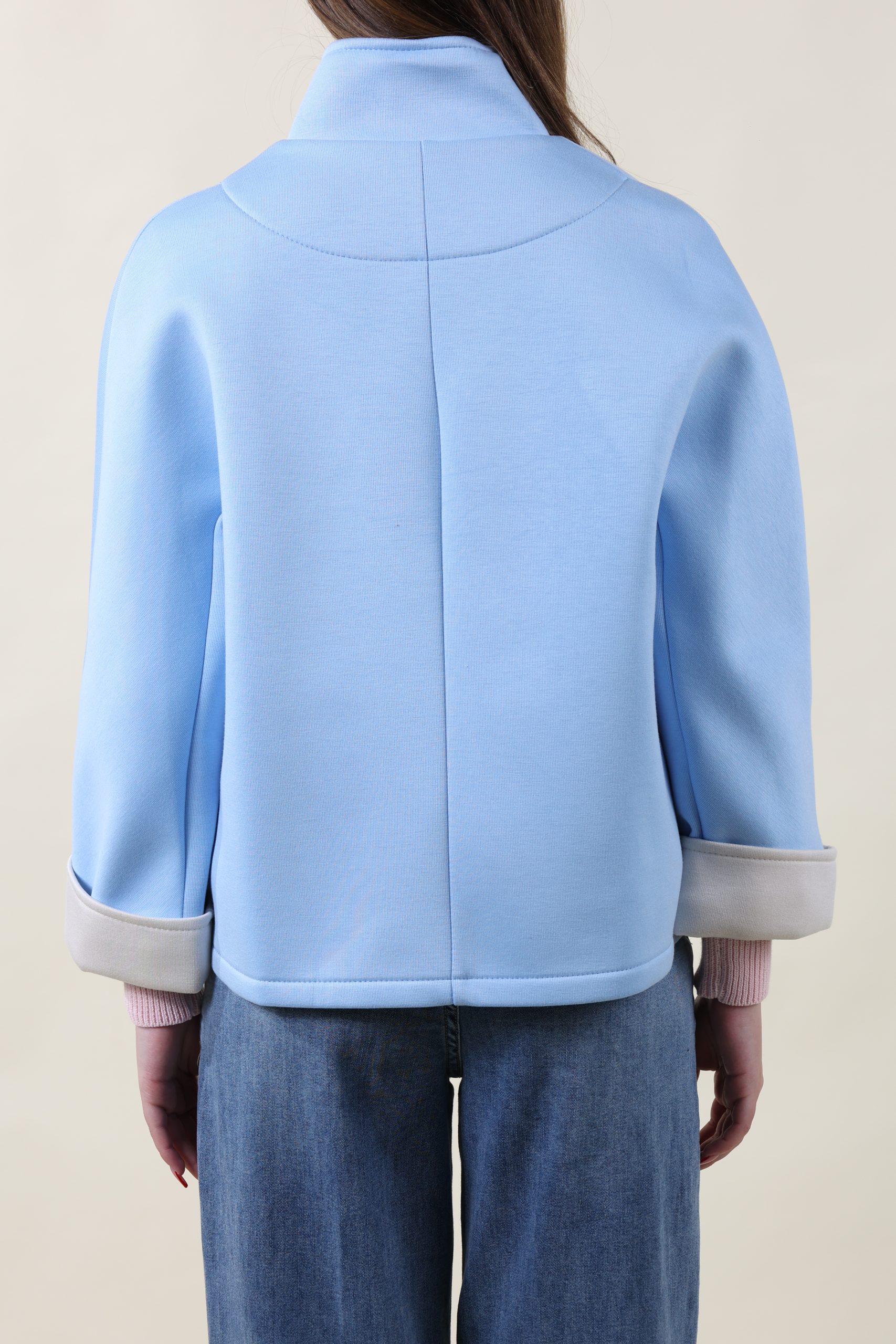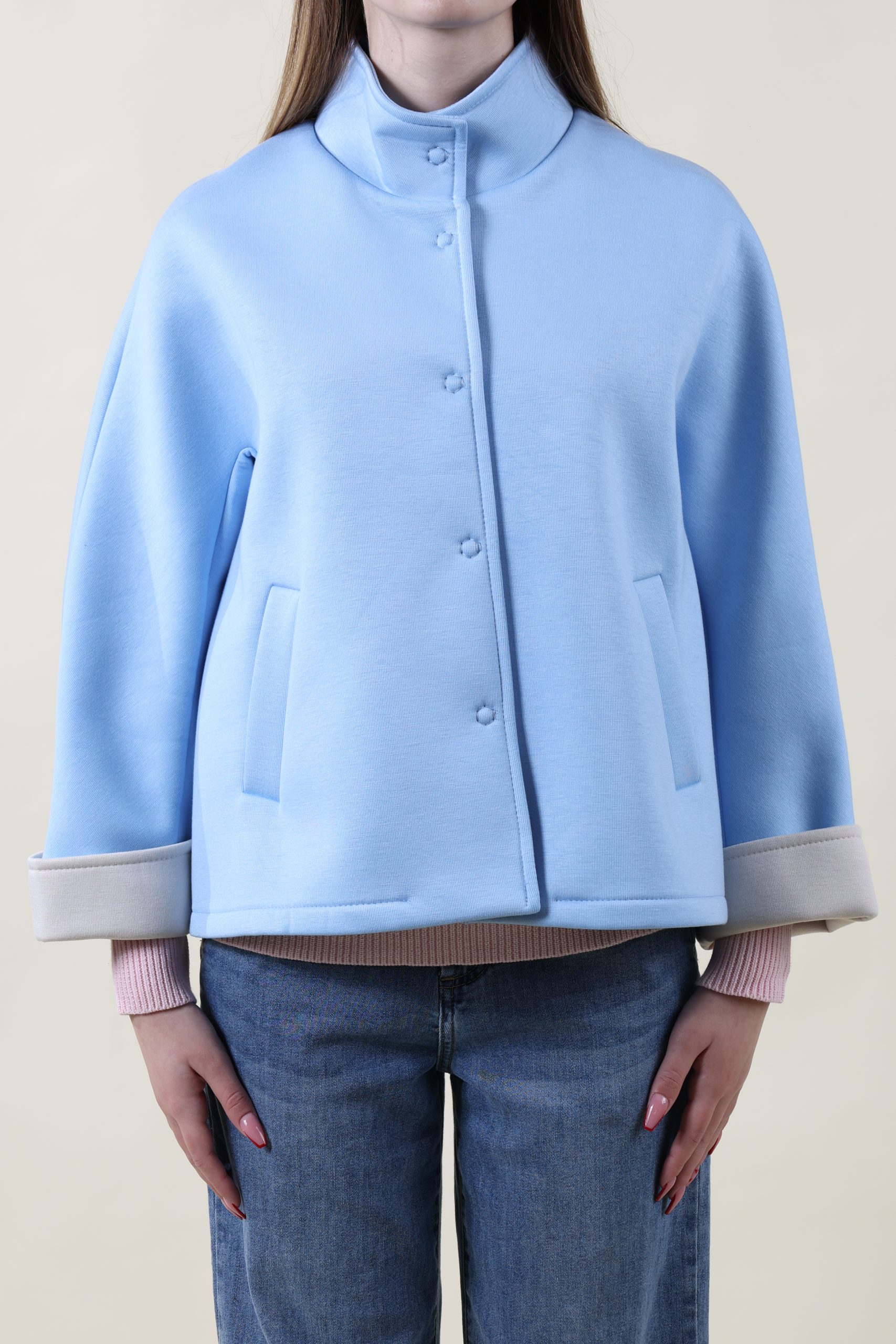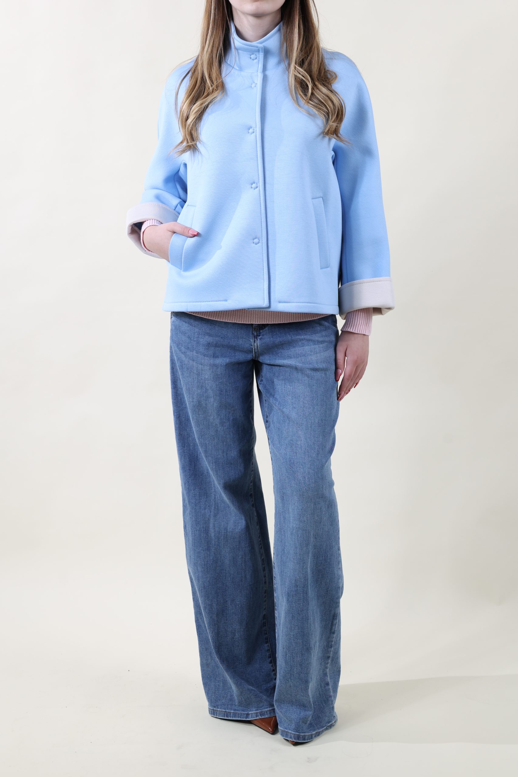 Giubbino in neoprene con bottoni automatici. Manica a 7/8 con polso a contrasto sempre in color naturale. Taglia unica, studiato per vestire bene dalla 40 alla 46 abbondante.
