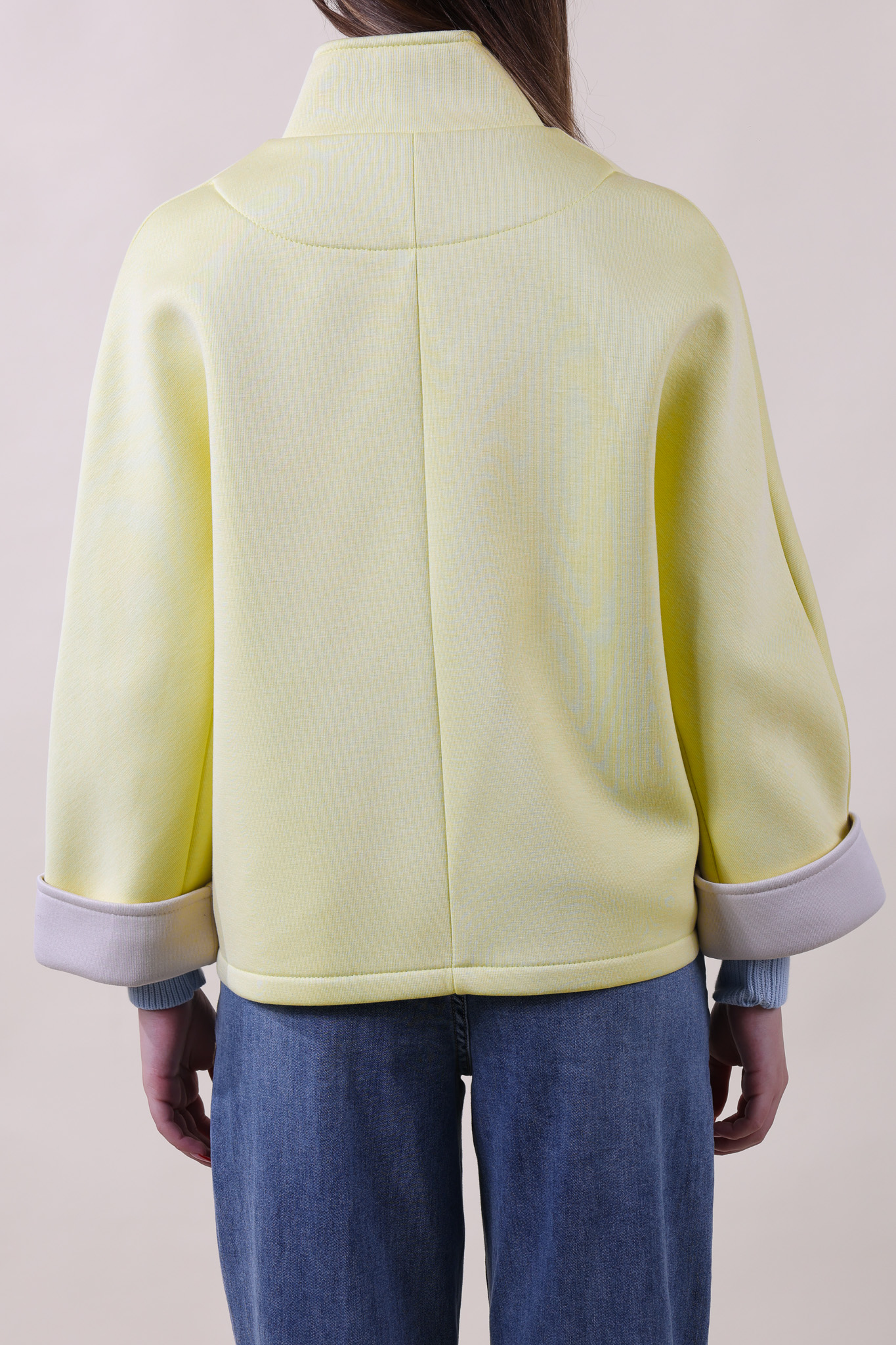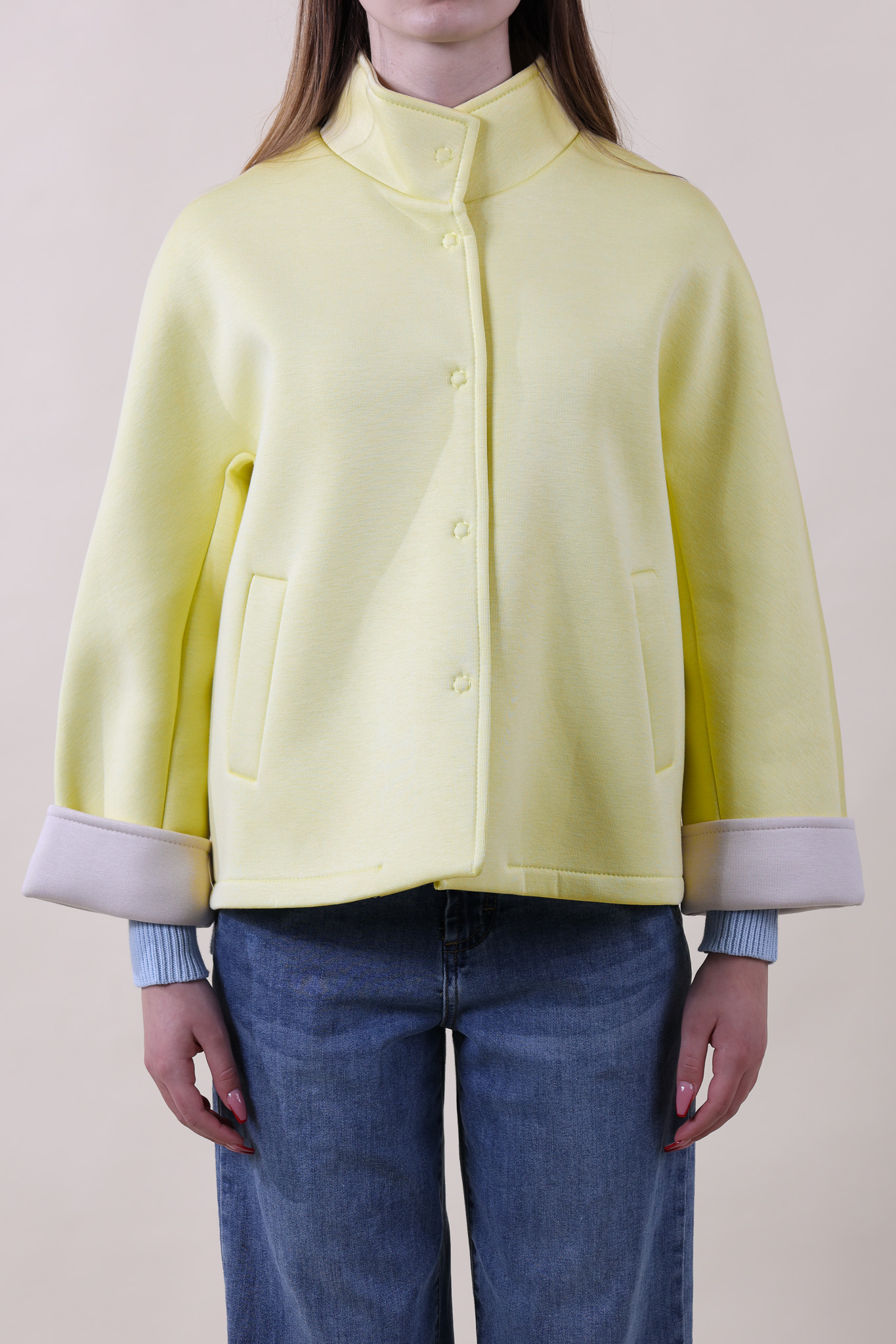Giubbino in neoprene con bottoni automatici. Manica a 7/8 con polso a contrasto sempre in color naturale. Taglia unica, studiato per vestire bene dalla 40 alla 46 abbondante.