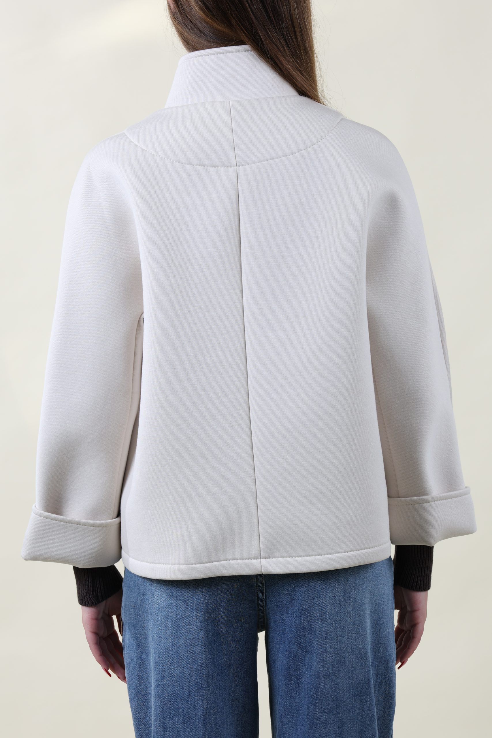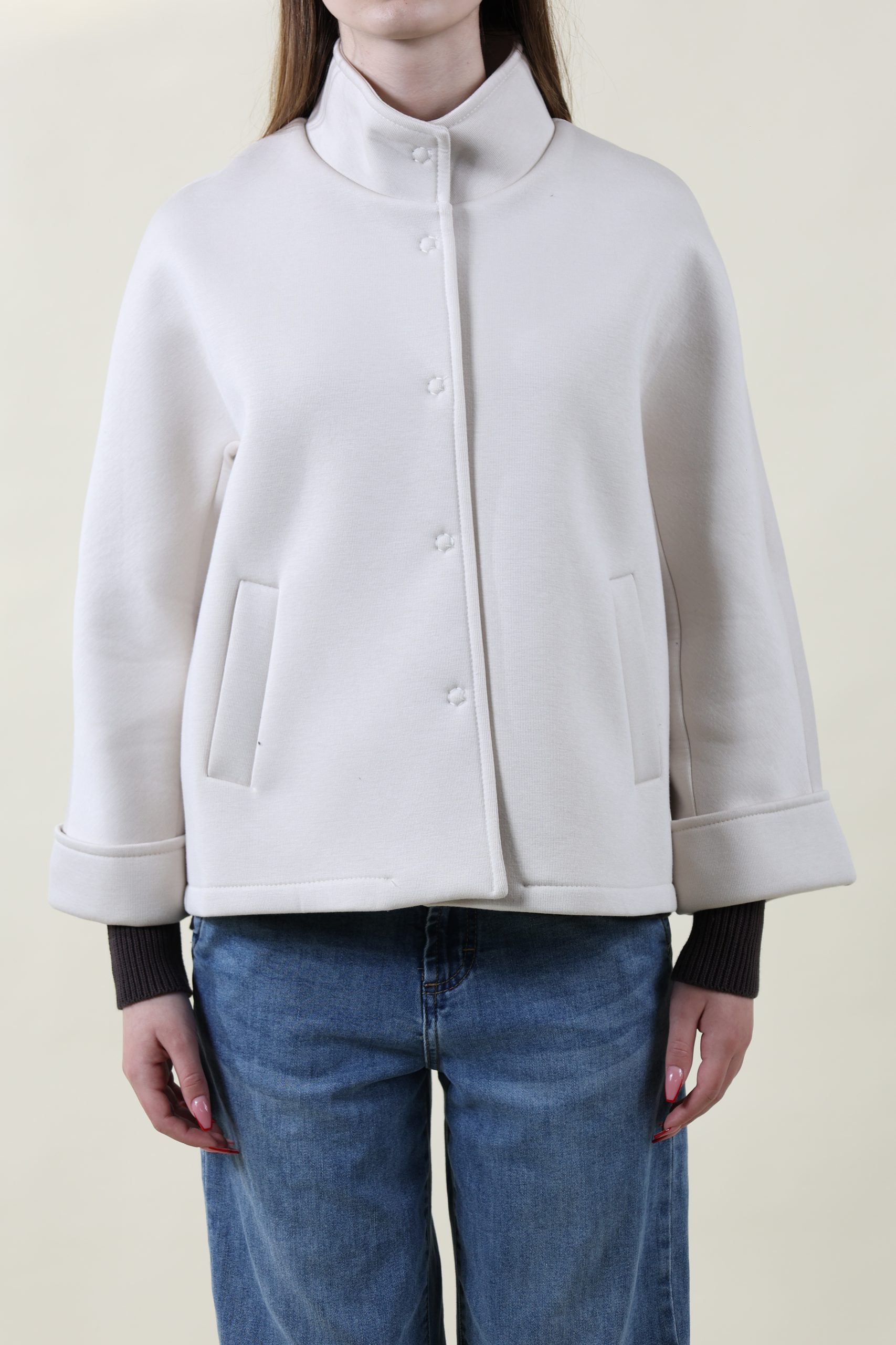 Giubbino in neoprene con bottoni automatici. Manica a 7/8 con polso a contrasto sempre in color naturale. Taglia unica, studiato per vestire bene dalla 40 alla 46 abbondante.