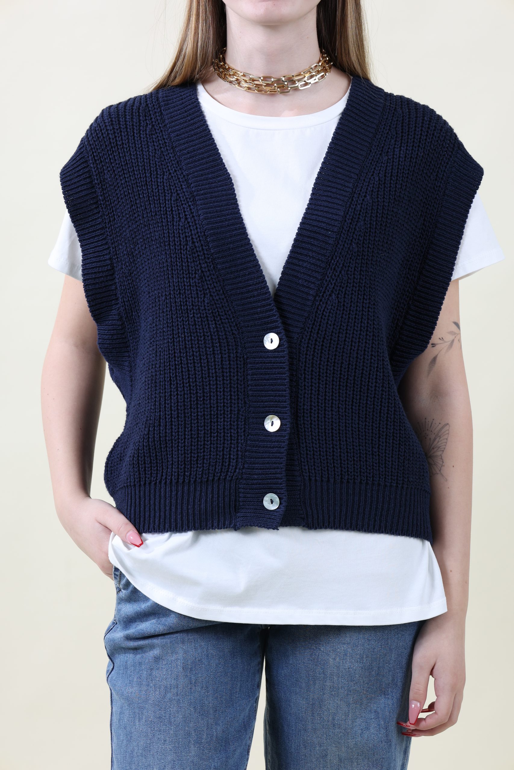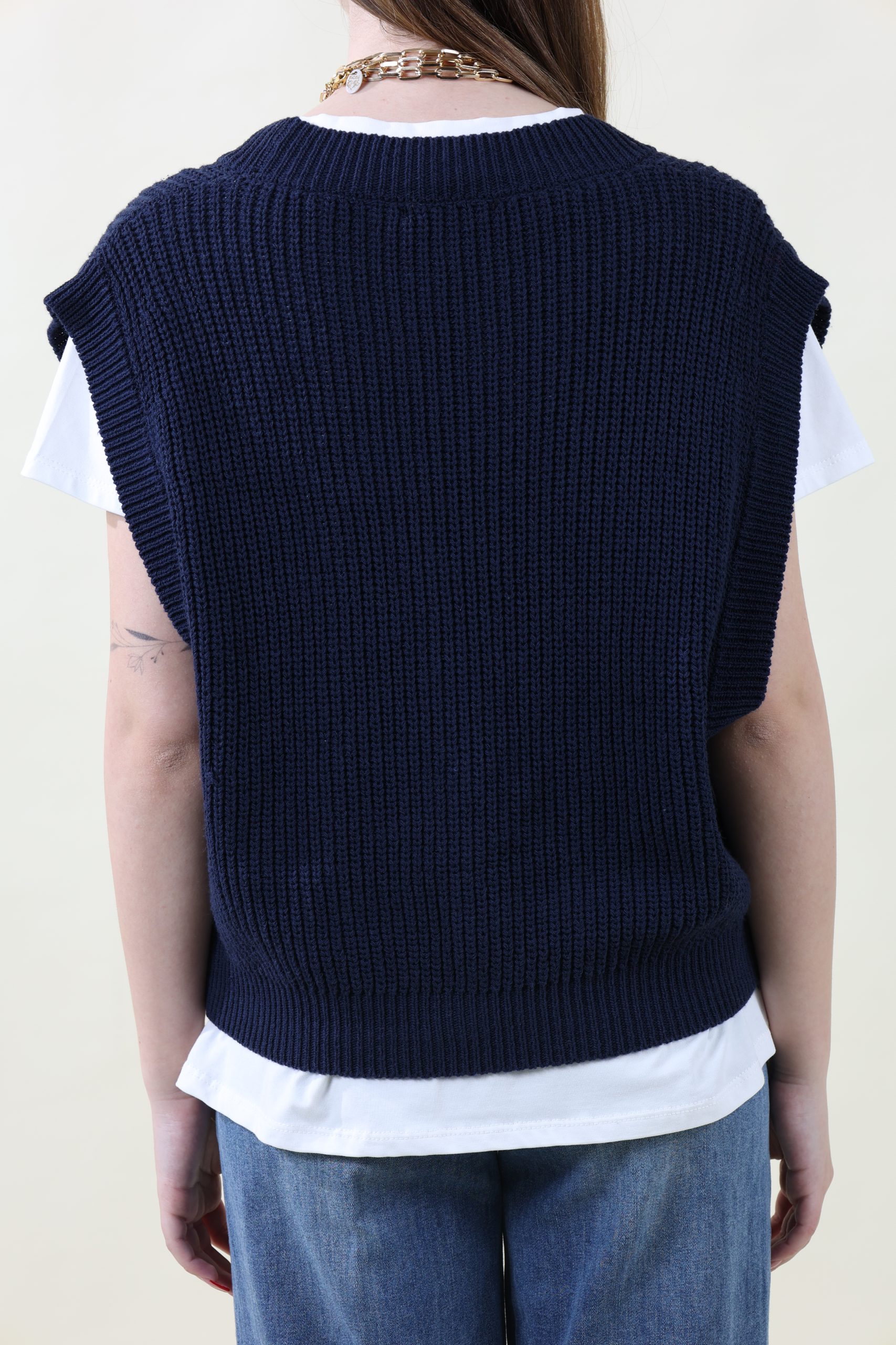 Gilet in maglia di cotone con abbottonatura davanti bassa. Pensato per sovrapposizioni con t-shirt e camicie. Fit morbido, taglia unica, veste dalla 40 alla 46 abbondante.