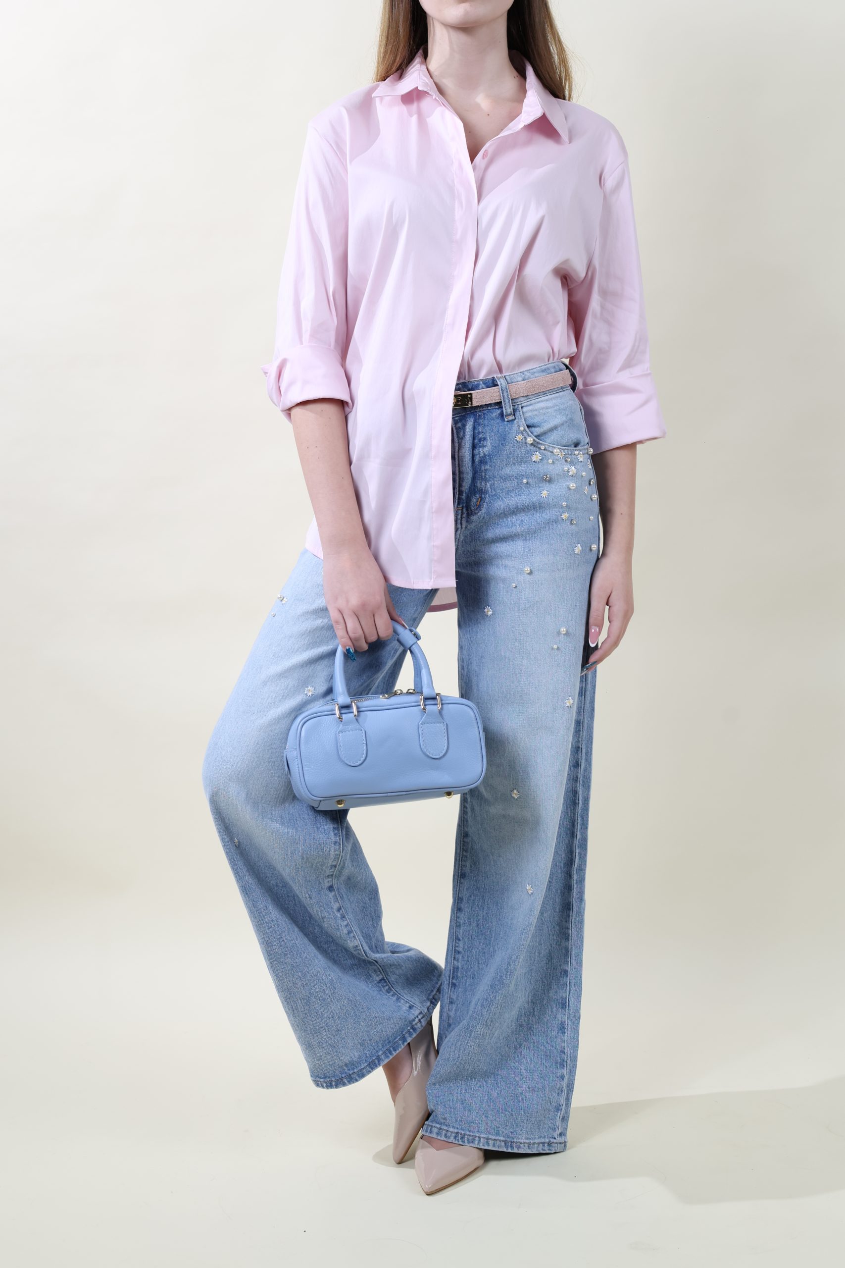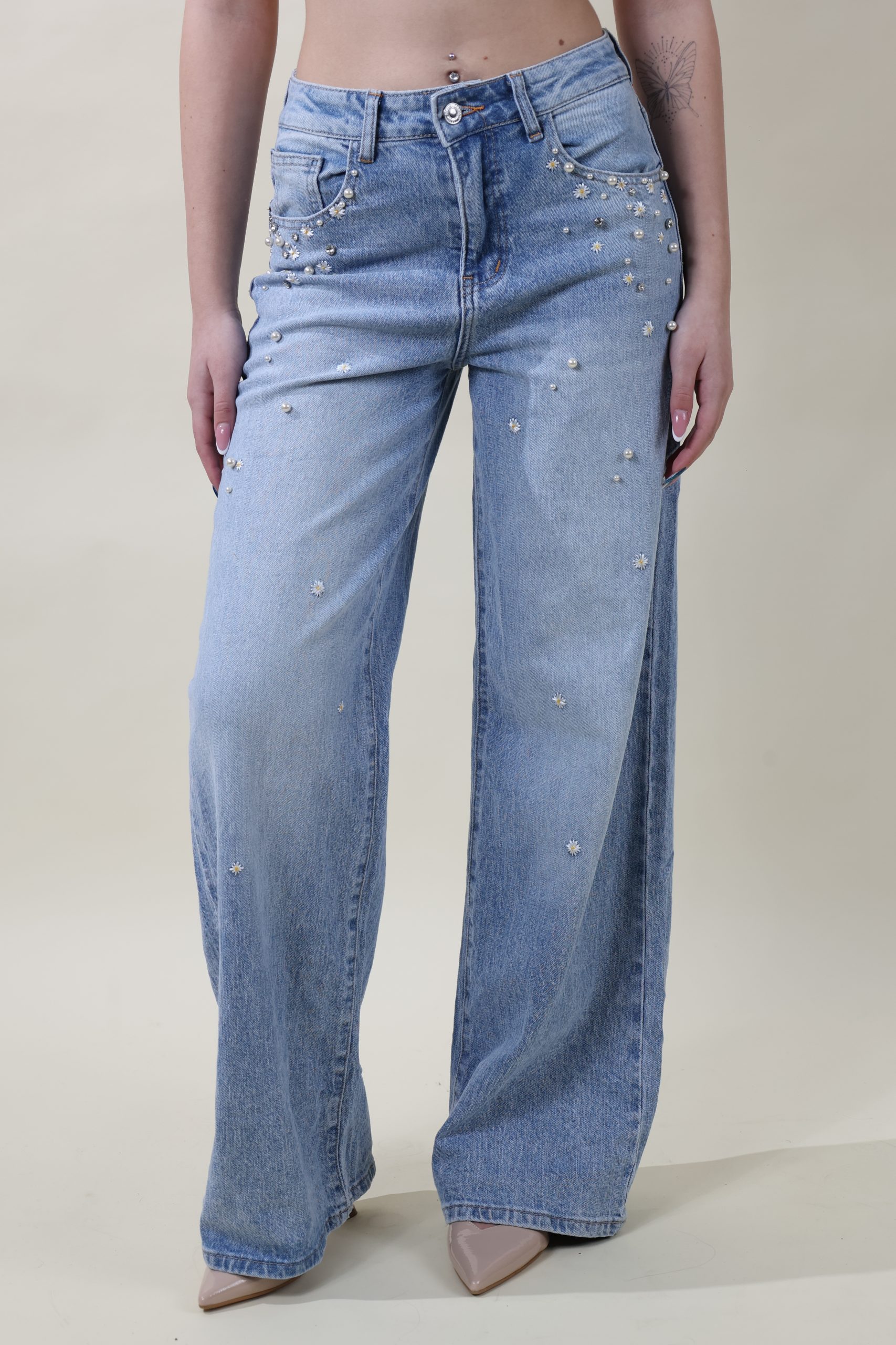 Jeans in tela denim chiara leggermente elasticizzata con gamba a palazzo ampia e decorato con ricami di piccole margherite, perle e castoni. Vestibilità regolare, vita piuttosto stretta. Taglie dalla XS (40) alla L (46).