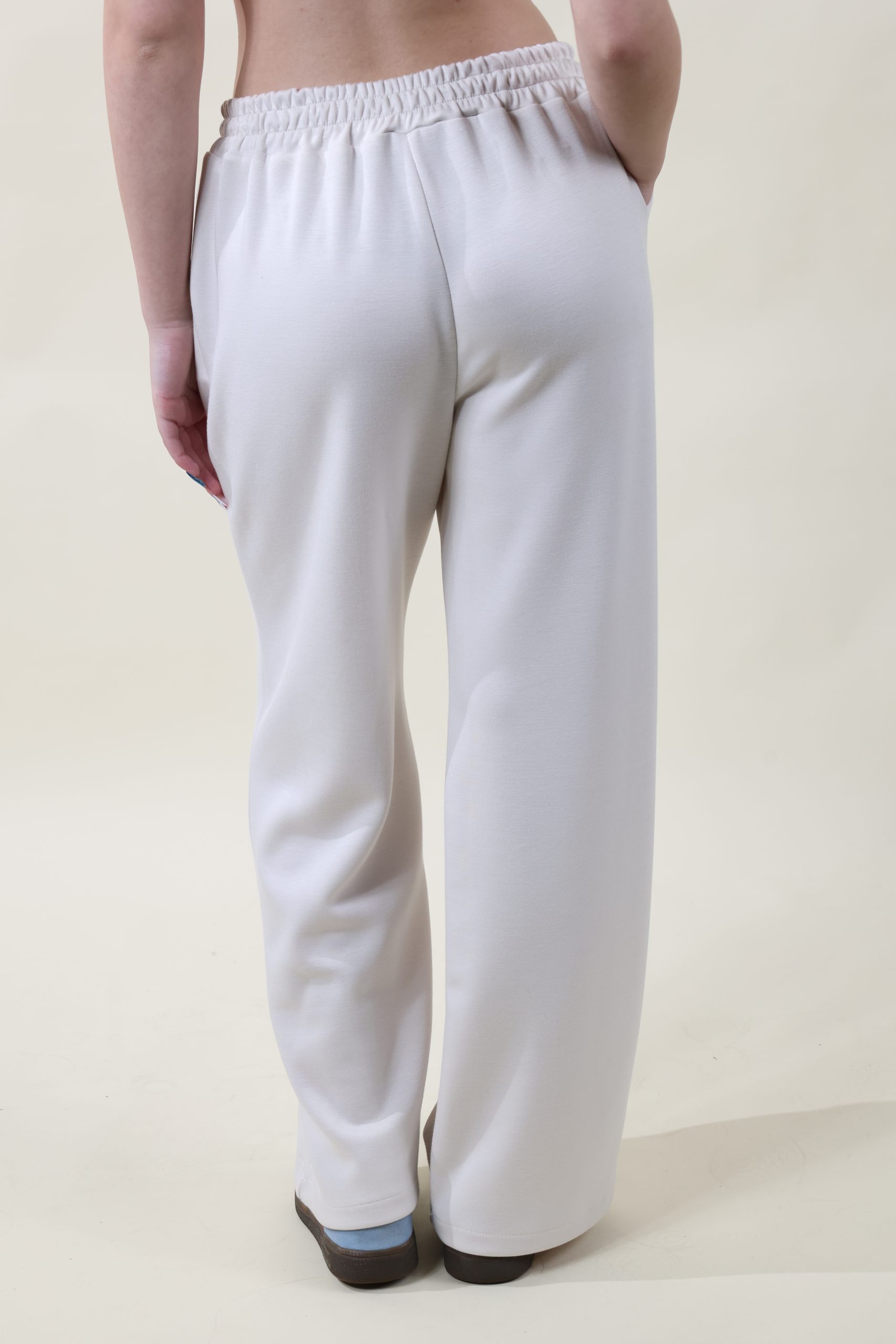 Jogger con elastico in vita in tessuto morbidissimo di viscosa. Gamba dritta a palazzo e tasche laterali. Fit comodo, taglie SM e ML, la SM veste dalla 40 alla 44 e la ML dalla 44 alla 48.