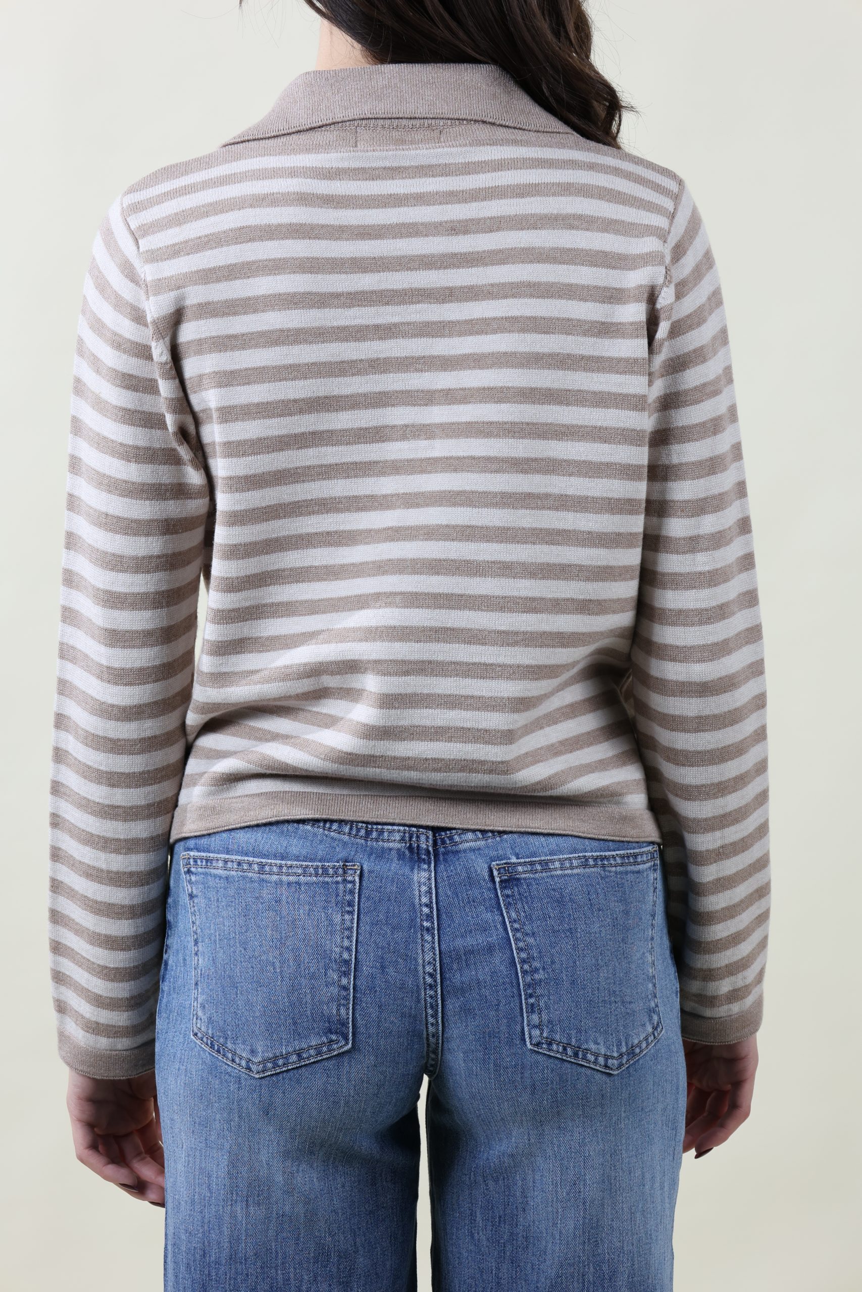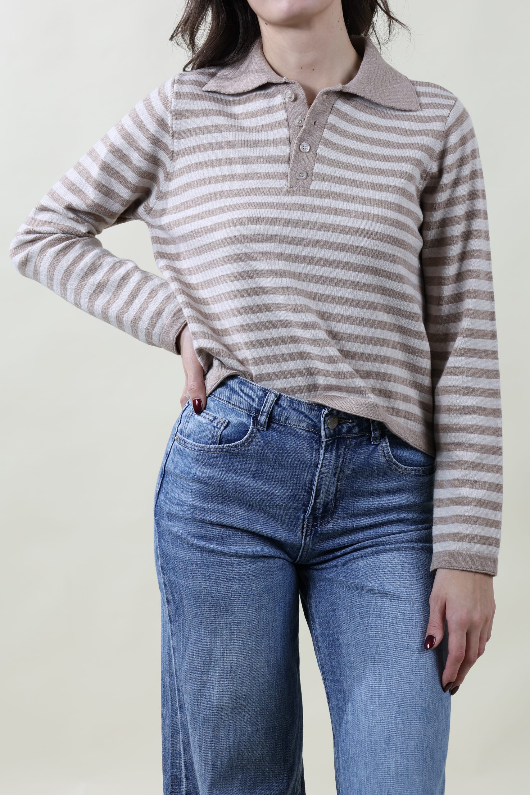 Maglia a polo con bottoncini in morbida viscosa mano calda a righe. Vestibilità slim, ma elasticizzata. Taglia unica, veste dalla 40 alla 46.