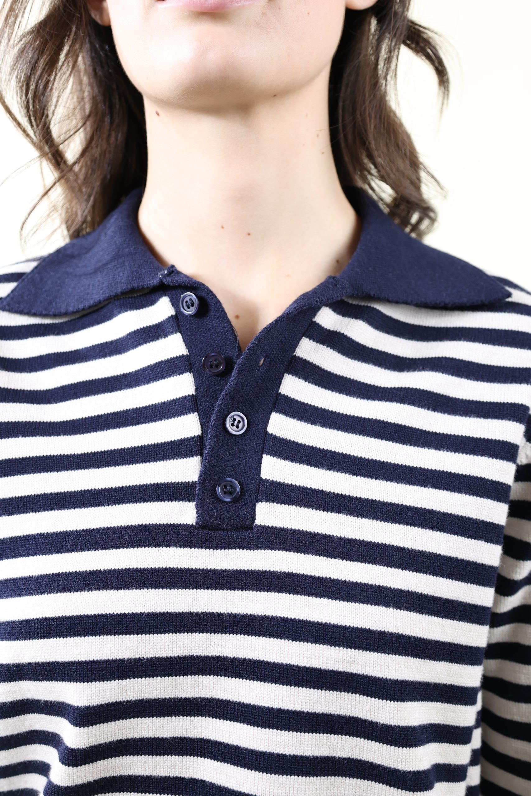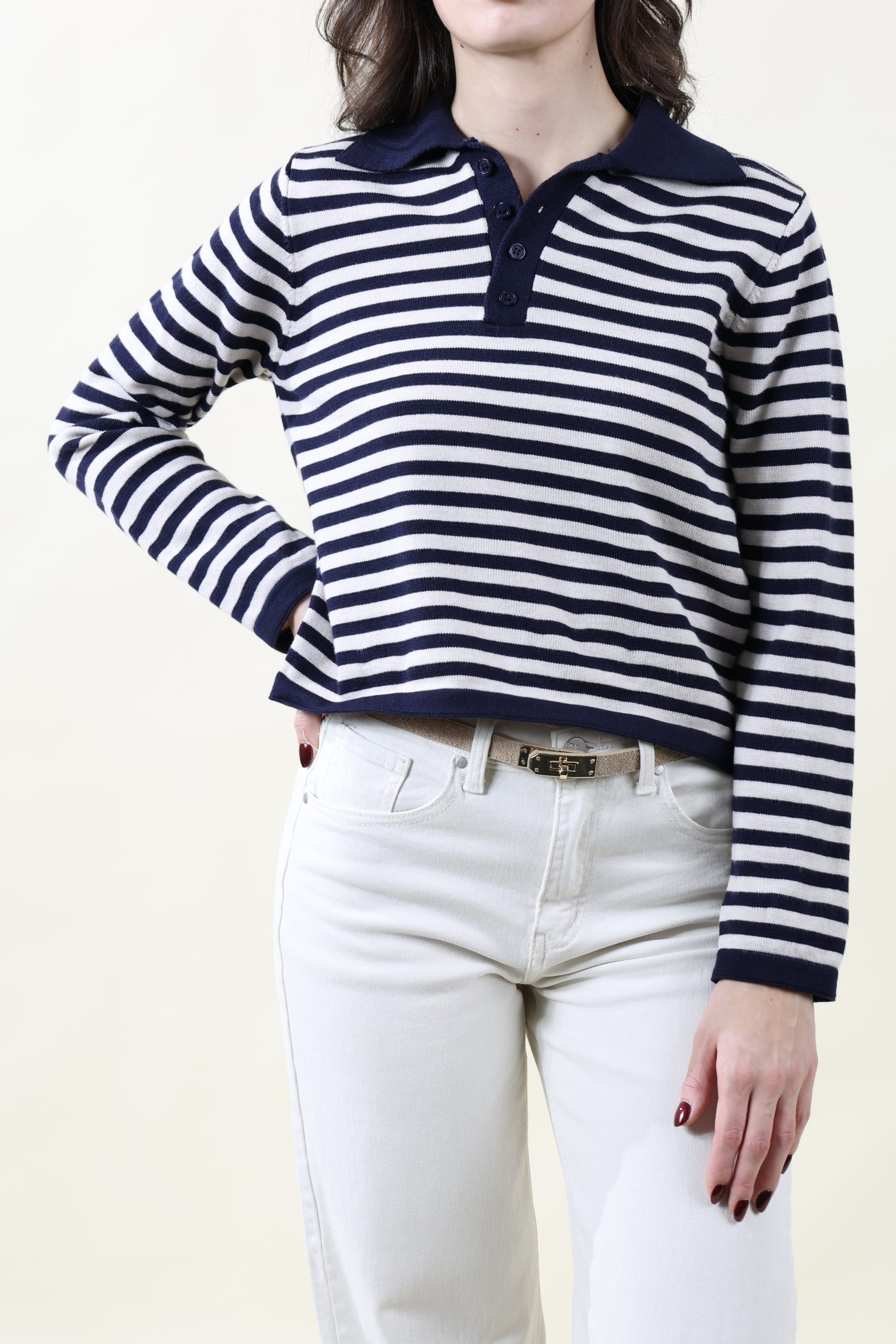 Maglia a polo con bottoncini in morbida viscosa mano calda a righe. Vestibilità slim, ma elasticizzata. Taglia unica, veste dalla 40 alla 46.