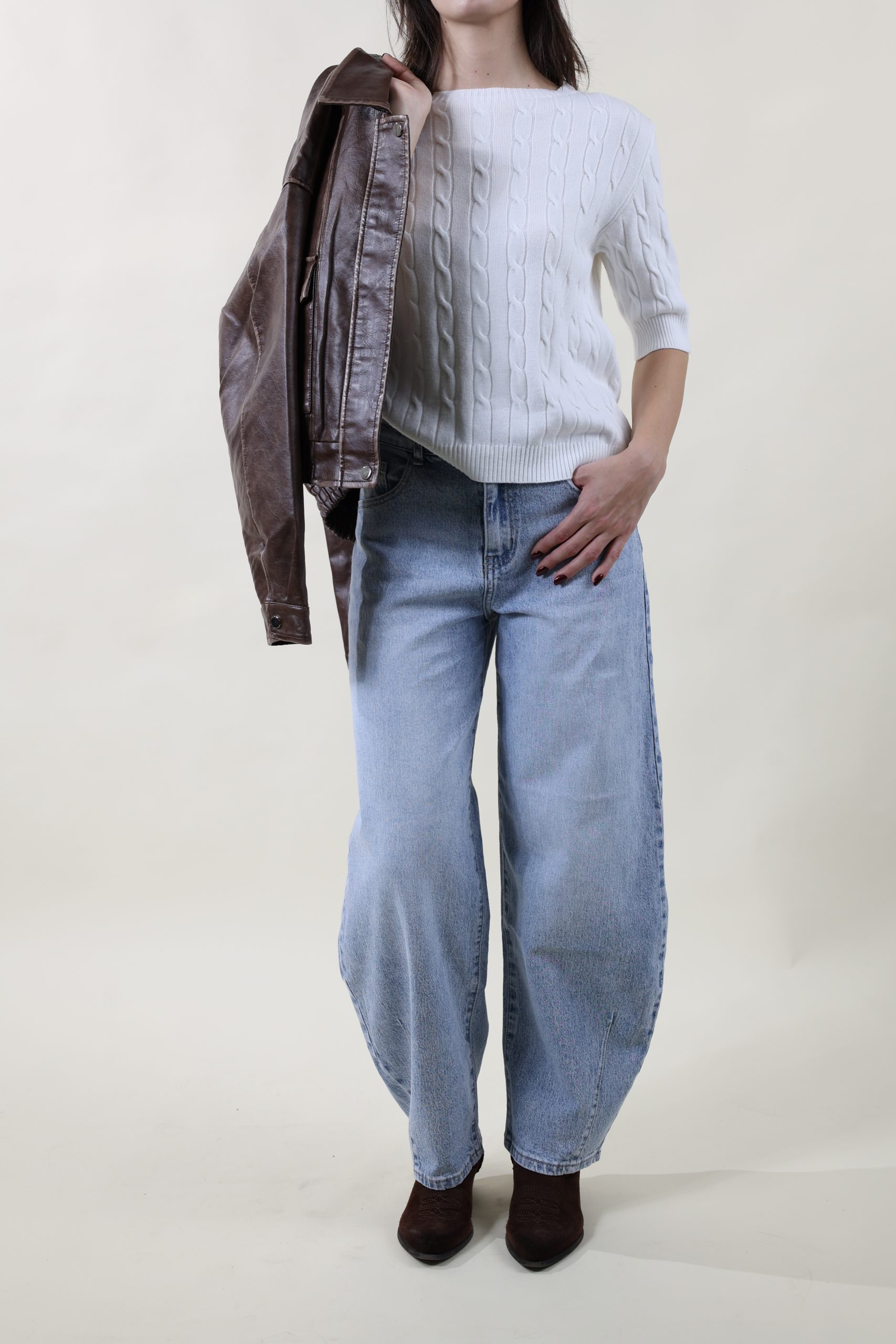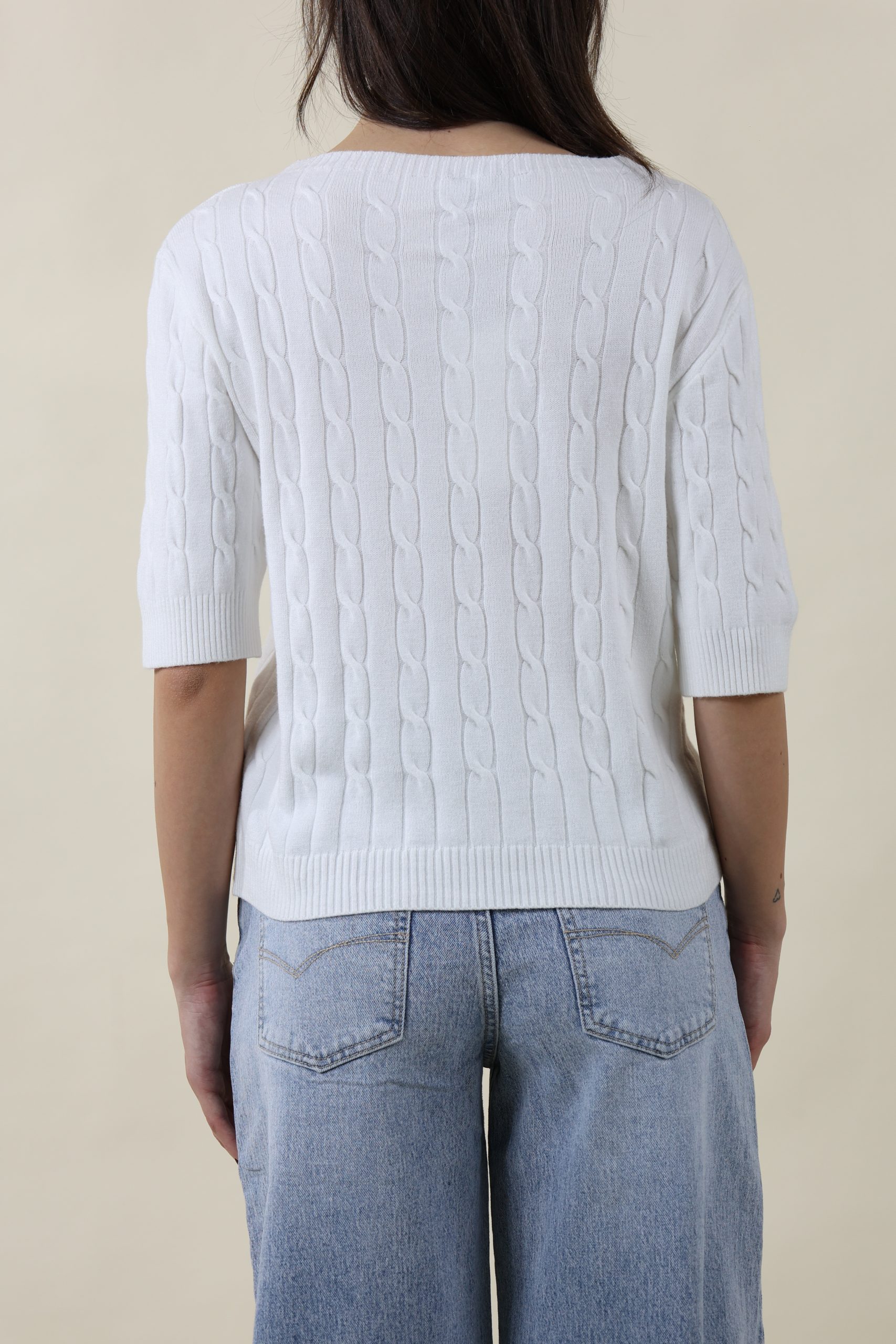 Maglia in morbida viscosa mano calda con lavorazione a treccine su tutto il corpo. Collo a barchetta e manica al gomito. Taglia unica, veste dalla 40 alla 46, fit aderente.