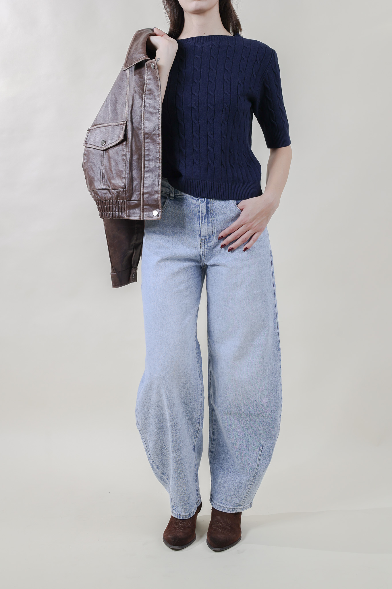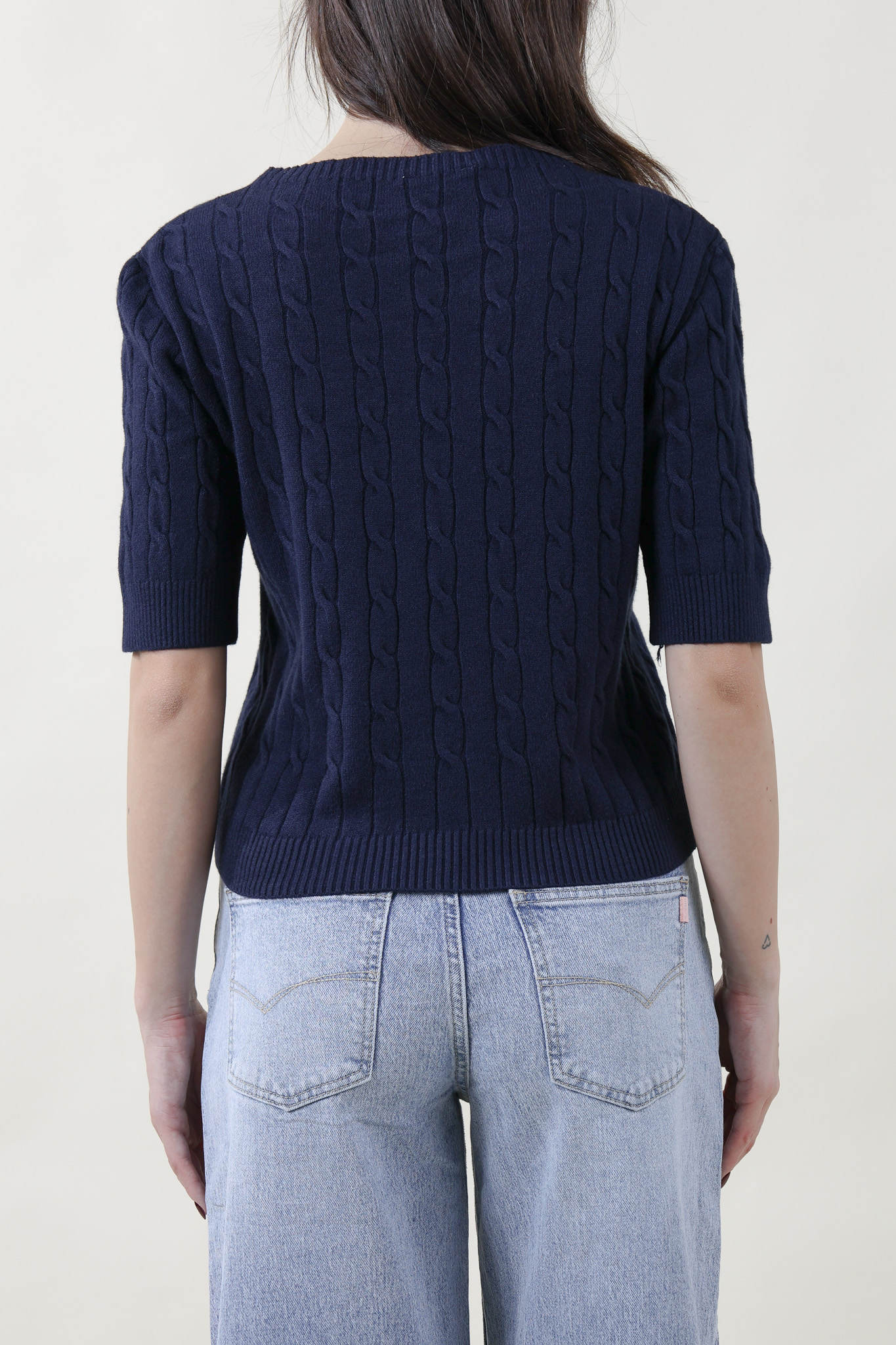 Maglia in morbida viscosa mano calda con lavorazione a treccine su tutto il corpo. Collo a barchetta e manica al gomito. Taglia unica, veste dalla 40 alla 46, fit aderente.