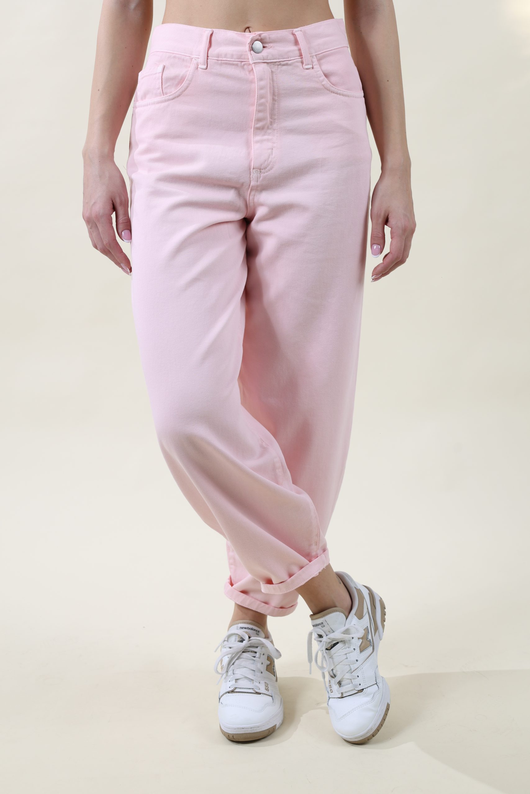 Pantalone cinque tasche effetto jeans in tela di cotone super morbida. Modello barrel a baloon sulla gamba, ma non esagerato. Vestibilità regolare, taglie dalla XS (40) alla L (46 abbondante).