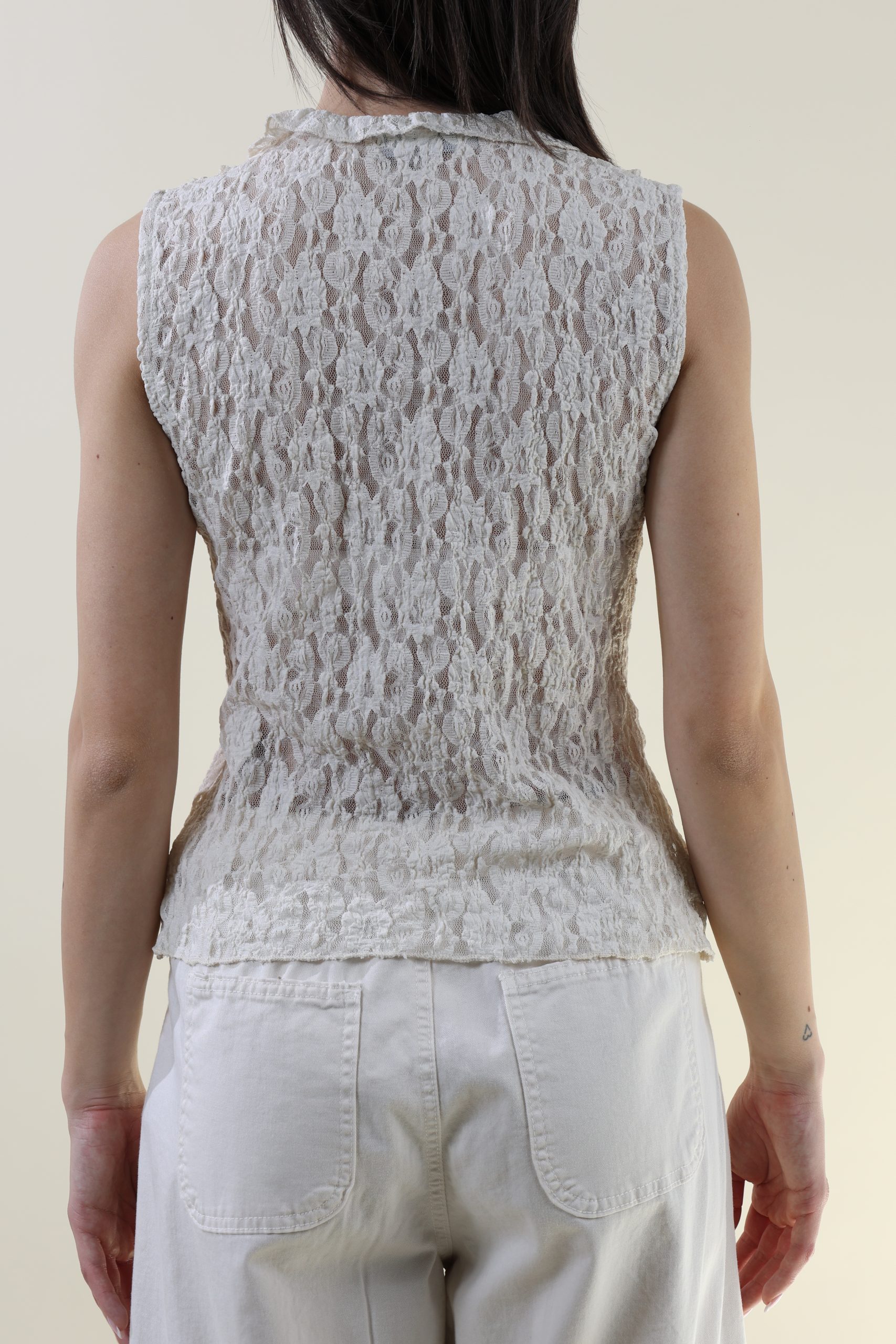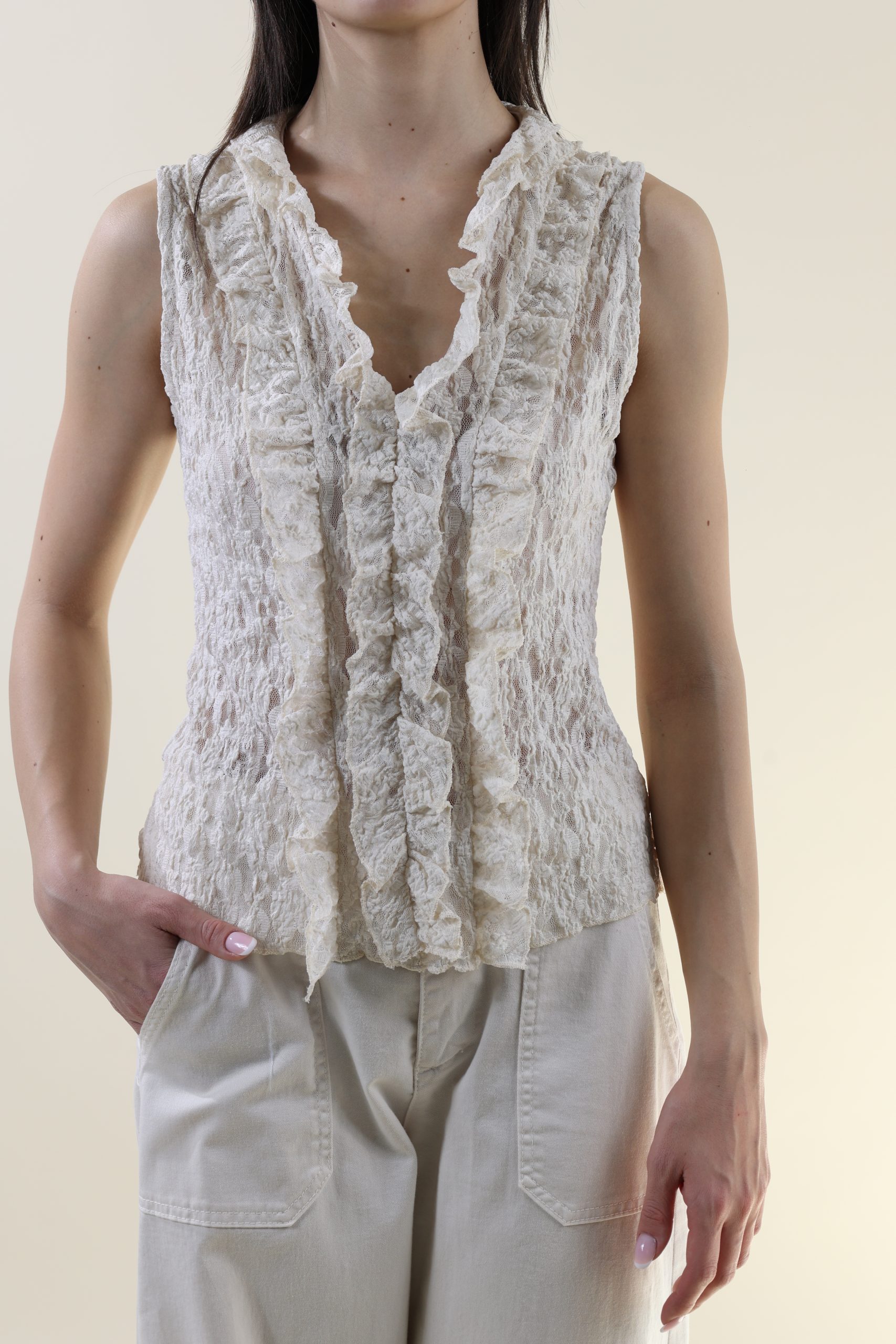 Blusina in pizzo morbido ed elasticizzato con motivo di piccola rouche lungo lo scollo. Taglie SM (40-44) e ML (44-48).